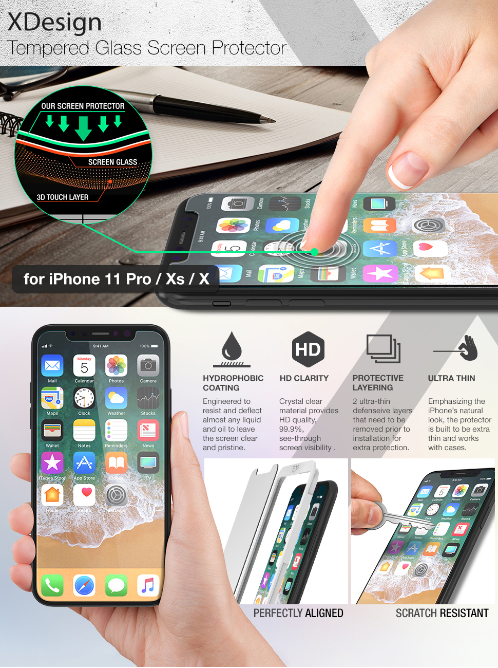 XDesign Glass Screen Protector Designed for iPhone 11 Pro and iPhone XS/iPhone X (3Pack) 5.8-Inch Tempered Glass with Touch Accurate/Impact Absorb+Easy Installation Tray [Fit with Most Cases]- 3 Pack