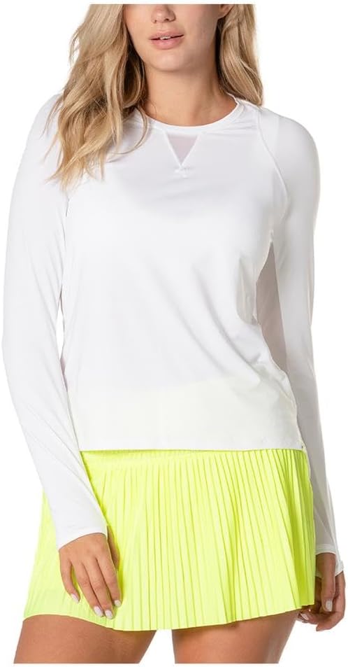 Lucky in Loves new long sleeve with LUV sun protection. This crew neck has a mesh V-neckline and sleeve panel interests for maximum breathability and thumbhole cuffs for additional coverage. Designed to fit along the bust then breaks into an easy fit along the waistline.