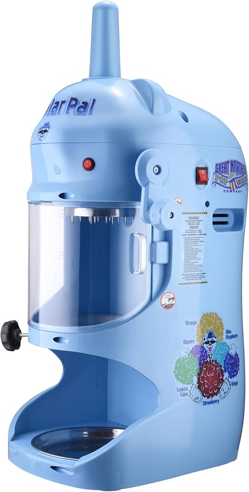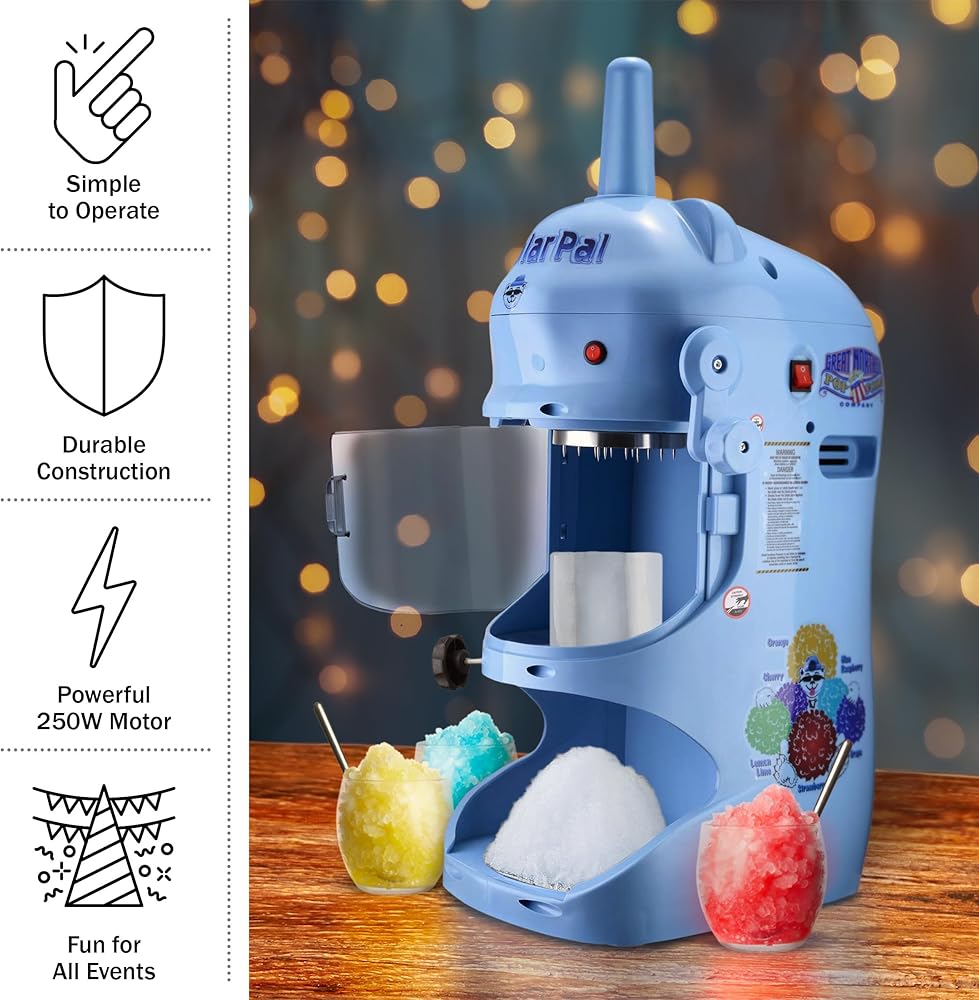 Prepare delicious frozen desserts or drinks for your next party, event, or cookout, with the Polar Pal Slushy Maker by Great Northern Popcorn. This powerful slushy machine features an adjustable shaving blade and a 250-watt motor that operates at 1420 RPMs to produce up to 3.5-pounds of shaved ice per minute. This slush machine will look great on your countertop, while the sturdy construction makes it durable and easy to clean.