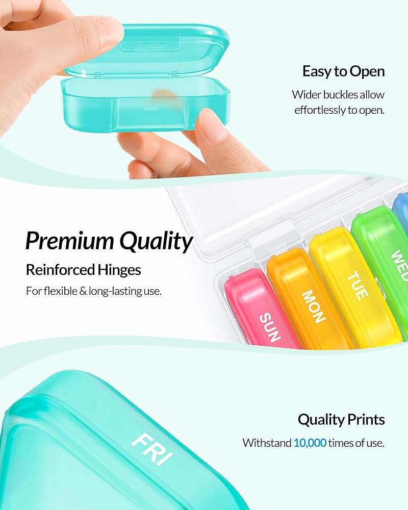 High-quality Pill Planner: This vitamin box organizer is built with reinforced hinges and durable UV prints to withstand over 10,000 uses. This pill container 7 day comes with 12-month worry-free warranty and our friendly customer service.