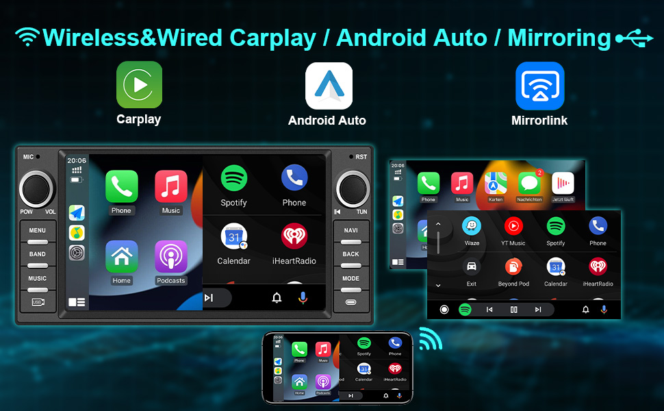 Apple Car Play/ Android Auto/ Mirror Link & Voice Control: This double din car stereo with wired and wireless Apple Carplay/Android Auto/Mirror Link allows you to seamlessly sync APPS from the IOS or Android smartphone to your vehicle, e.g. navigation, phone, message, music, video and radio. Just use this car audio receiver and say goodbye to the phone mount. With the help of voice control from Siri and Google Assistant, you can handle tasks without hands. Safe driving at new heights!