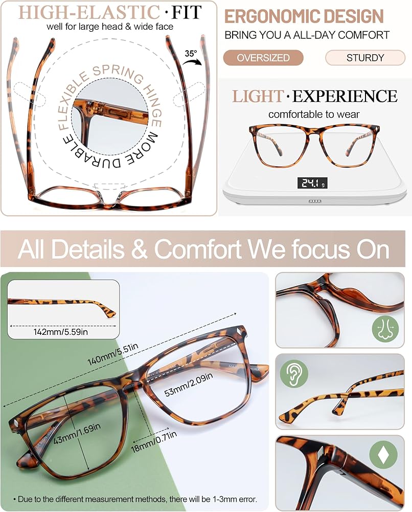 High definition vision: A-class large readers 4.00 has higher precision to read small print easily, good transmittance, reduce reflection & scratch resistant, easy to clean. Extra large square reader glasses ensures true color, no blur or distortion, bigger field of view without turning your neck to easily get a clear vision.