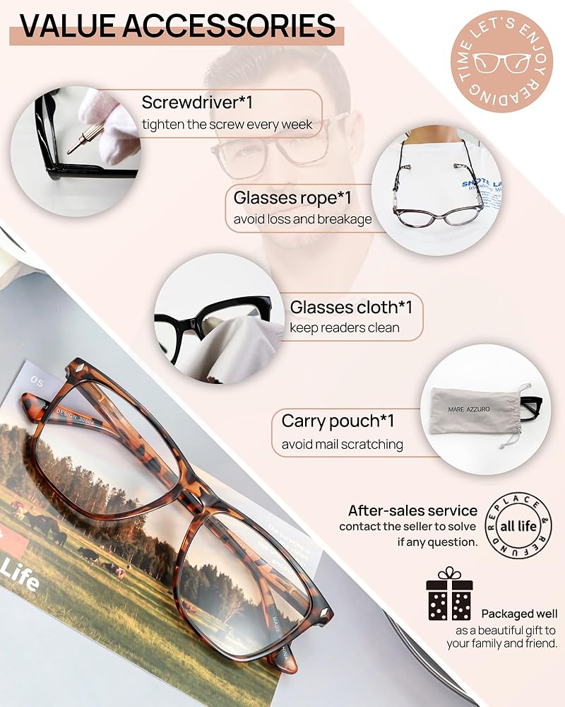 Value accessories: A small screwdriver to tighten the screws regularly; A glasses chains to avoid loss and breakage; A soft cloth to keep reader clean; A drawstring bag to carry; A glasses case to store; as a beautiful gift to family or friend!