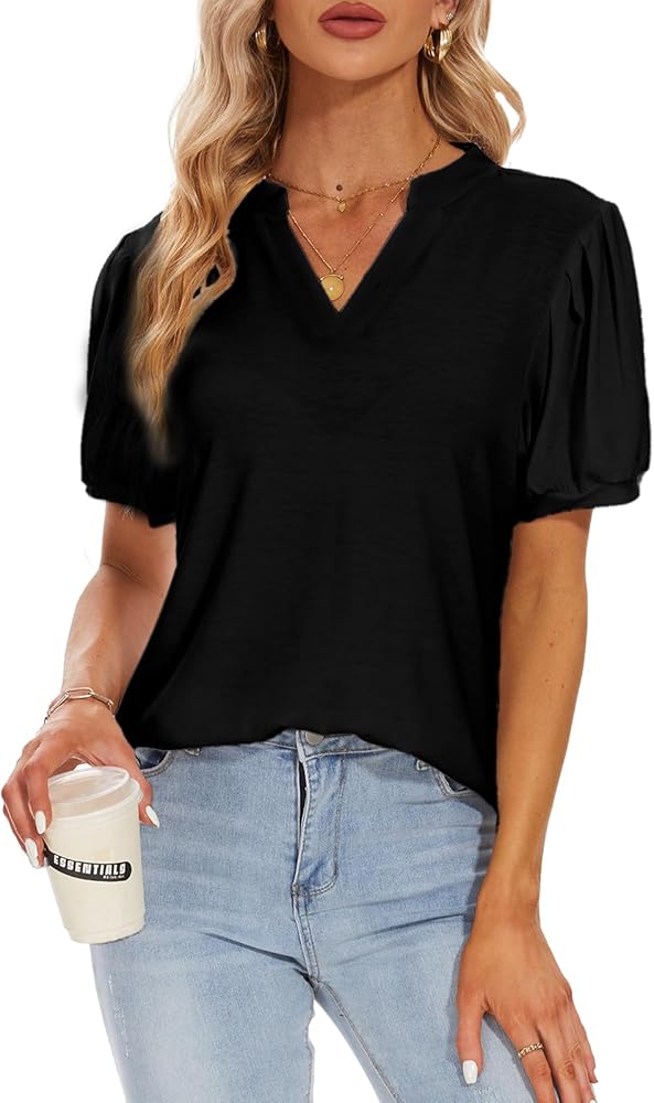 【Pecial Design】: Classic T-shirt, basic solid color top, V-neck and unique pleated Puff sleeve design.