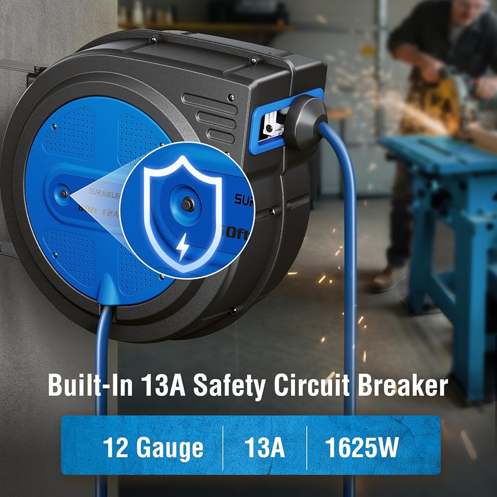 【 Durable Heavy Duty Cord Reel with Breaker 】12 Gauge thick SJTOW power cable; 15A/1875W power rating; 15 Amp circuit breaker; reinforced 3 prong plug; sturdy and durable polypropylene case lasts longer than you expect; this high-quality retractable extension cord reel is designed for both normal household work and small to medium professional heavy equipment; UL listed