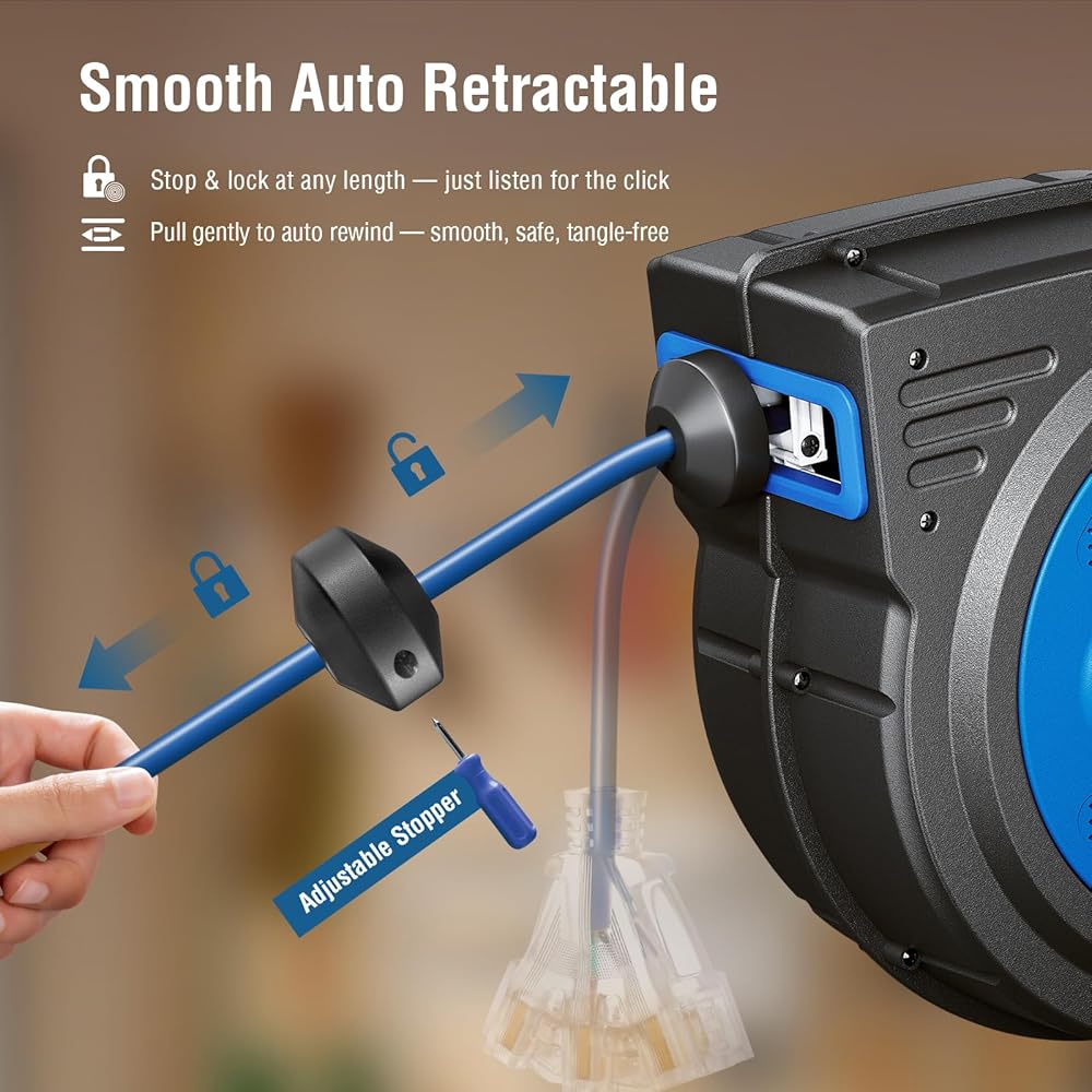 【 Smooth Auto Retractable Rewind System and Stopper 】Advanced double ratcheting system double locks the cord inside, allowing you to get as much length as required for your work; or kinks back the cord smoothly, leaving the desired length of cord out with an adjustable stopper; keeps the cord neat and out of the way and your space clutter-free