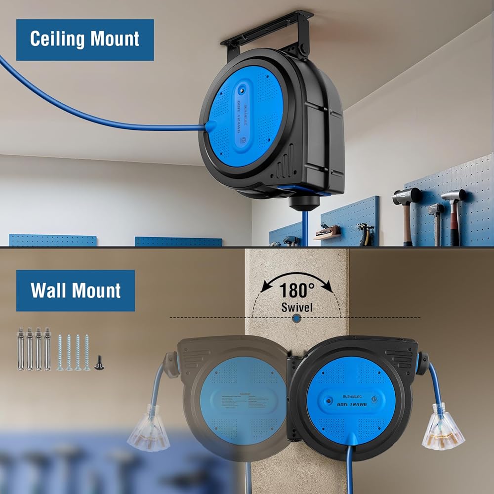 【 60 FT Retractable Cord + 4.5 FT Lead-in Cord 】60 foot retractable power cord enables you a great reach across your home or garage; perfect for running power tools and other high power equipment including circular saws, drills, and major commercial tools; 4.5 ft lead-in cord ensures the reel can be mounted in the desired location without needing any additional extensions to the wall or ceiling outlet