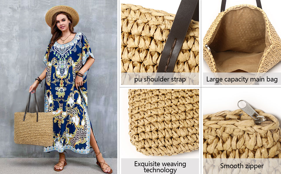 Features: Straw beach bag 18.9*15.6 inches, shoulder strap height: X8.26, with a zipper on the top, large enough to hold the necessities you need on vacation