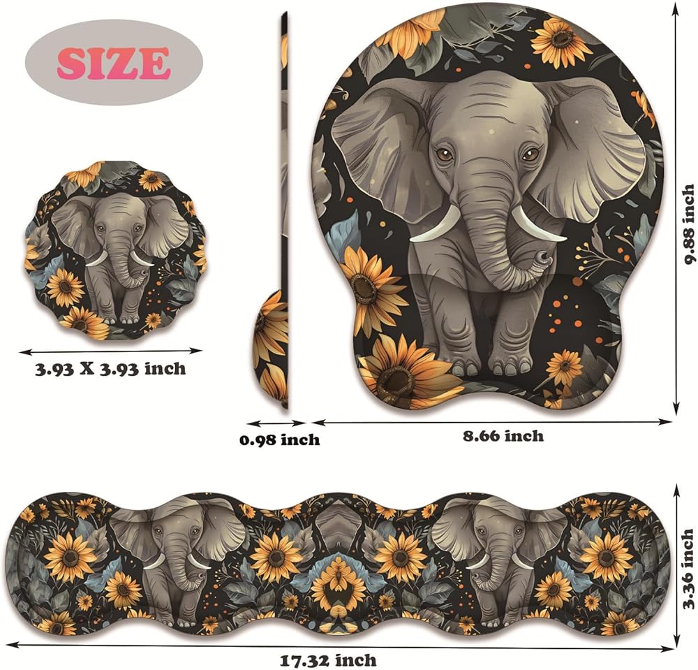 Product size: Mouse pad wrist support (9.88 "x 8.66" x 0.98 ") Keyboard wrist pad (17.32" x 3.36" x 0.98"); Coffee coaster (3.93" x 3.93" x 0.08")