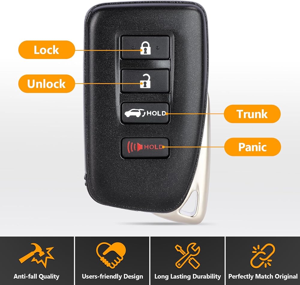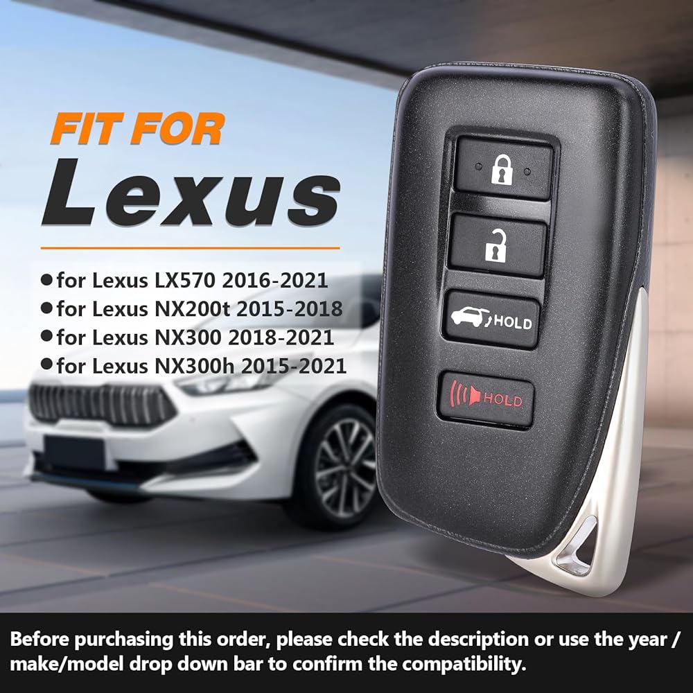 COMPABILITY: Fits for Lexus LX570 2016-2021, for Lexus NX200t 2015-2018, for Lexus NX300 2018-2021, for Lexus NX300h 2015-2021. Please check the description or use the year/make/model to confirm the compatibility, ensure your key is exactly same as ours(the same shape, buttons)