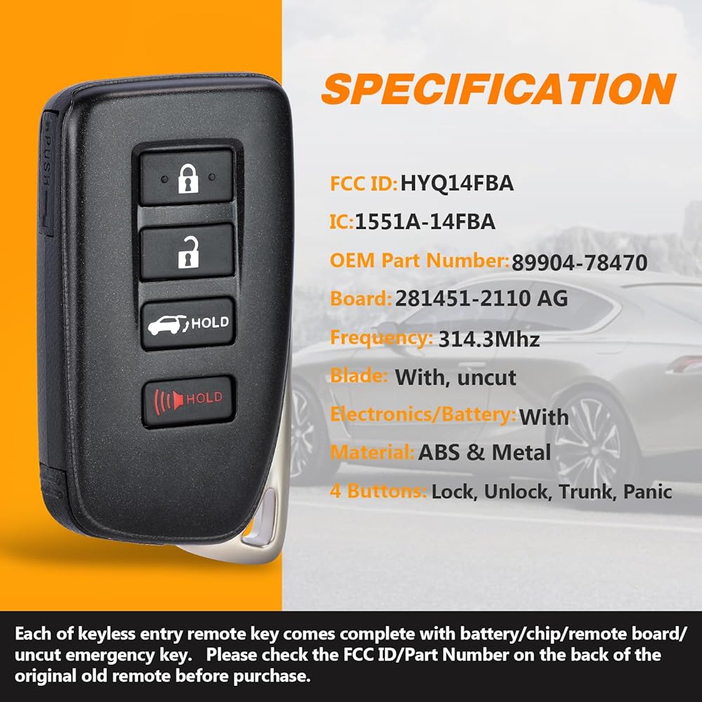 REPLACEMENT: FCC ID:HYQ14FBA, compatible with part numbers: 89904-78470. Fully tested complete remotes with a battery installed. Please check the FCC ID/Part Number on the side of the original old remote before purchase