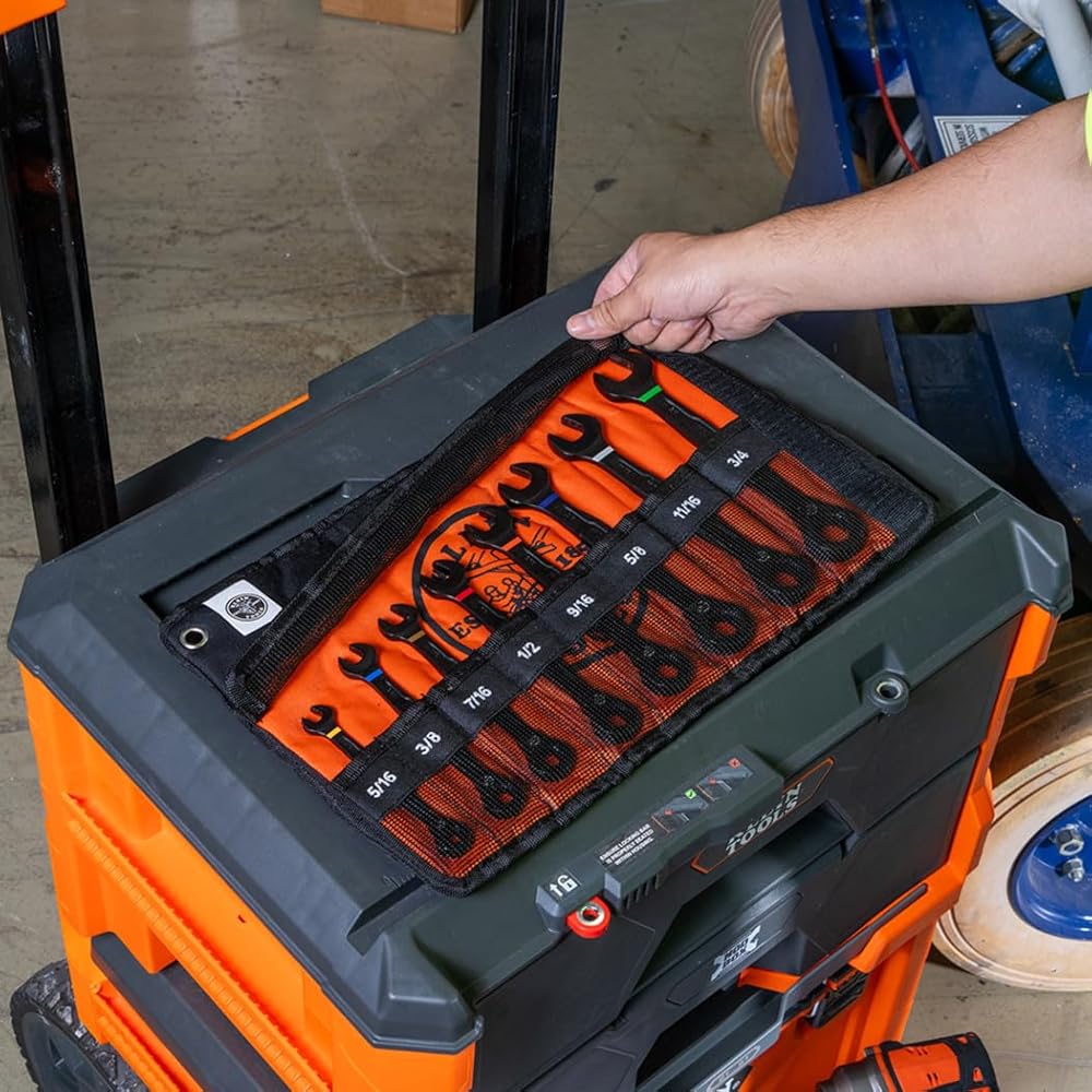 The Klein Tools Ratcheting Combination Set contains eight SAE wrenches with color coded size markings to easily identify each tool. These wrenches are made from cold-forged steel alloy precision machining finish and black phosphate coating for long-lasting rust prevention. The 90-tooth ratchet mechanism minimizes the return angle for maximum access. For more than 160 years, Klein Tools has manufactured premium-quality, professional-grade hand tools that deliver the performance, durability and precision needed to get the job done right. Our family of engineers, workers and craftsman continue to put six generations of expertise into every tool we create by using only the highest quality materials, superior workmanship, and keeping manufacturing as close to home as we can. Klein isn't just the name of our company, it's also our family name. And since we're an American company that's family-owned and family-run, you know you can count on us to be here tomorrow. Klein Tools doesn't just make great products, we make great products that stand up to the demands of the professionals who use them every day ... Since 1857.