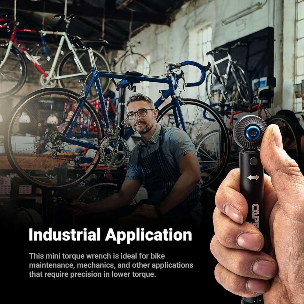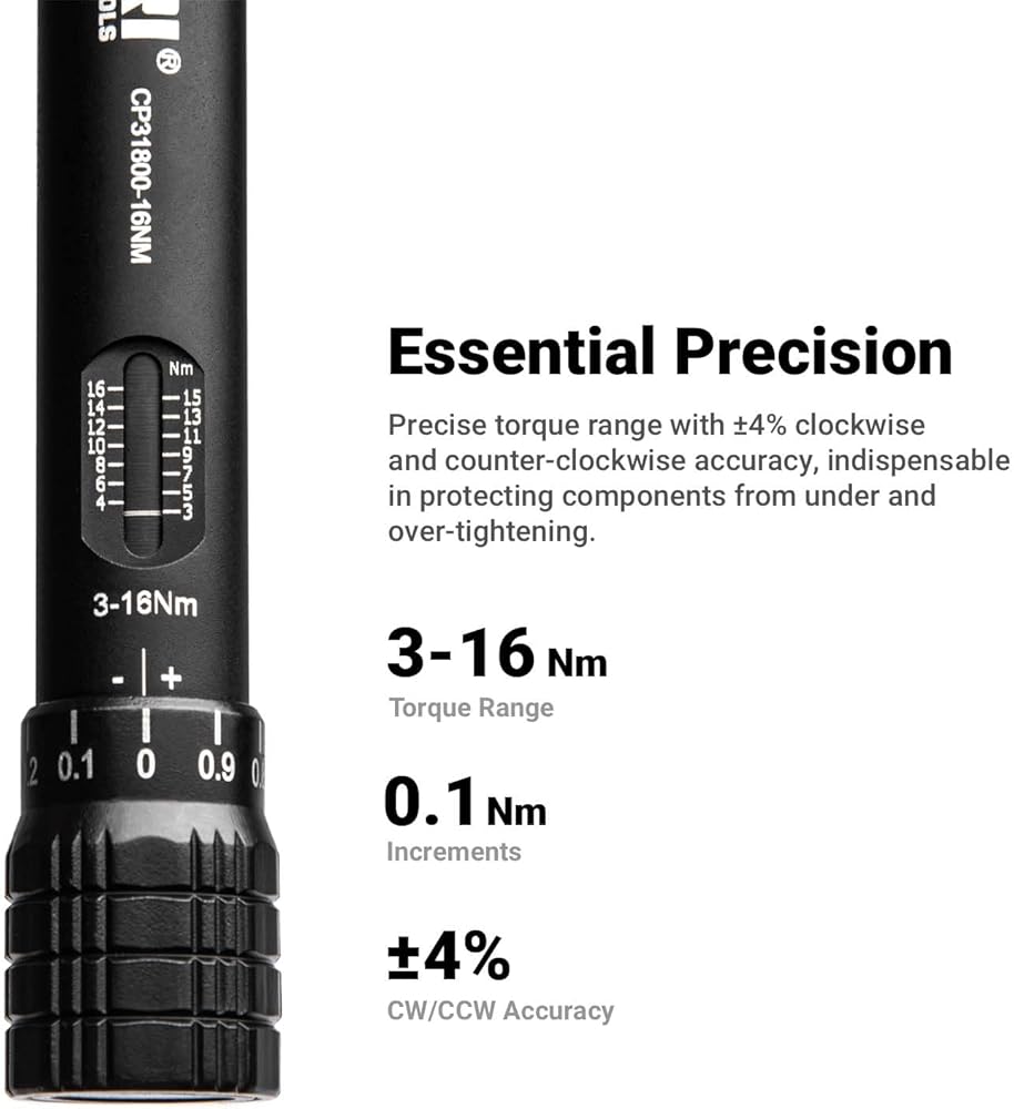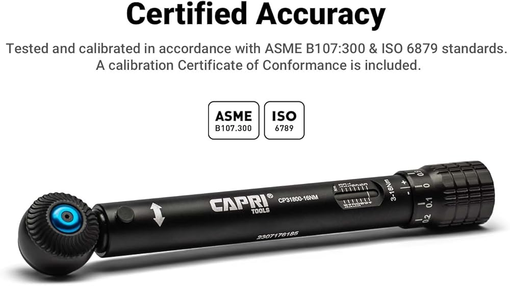 This mini torque wrench is essential for working with bolts and fasteners in confined areas where a larger torque wrench doesn't fit comfortably. 1/4 in. drive, 3-16 Nm torque range in 0.1 Nm increments, and +-4% CW/CCW accuracy give you the precision you need in the lower torque range. Light and durable matte black anodized aluminum body and weighs just 1.7 lbs. Certified +-4% CW/CCW accuracy. A Certificate of Conformance with individualized traceable serial number is included. Set includes (1) hex socket adapter, (1) extension bar, (5) slotted screwdriver bits: 3, 4, 5, 5.5, 6 mm, (4) Phillips screwdriver bits: PH0, PH1, PH2, PH3, (6) hex screwdriver bits: 3, 4, 5, 6, 8, 10 mm, and (4) star screwdriver bits: T10, R15, T25, T30, organized in a premium custom carry case. The Capri Tools 1/4 in. Drive Mini Torque Wrench is essential for working with bolts and fasteners in confined areas where larger torque wrench doesn't fit comfortably. The 3-16 Nm torque range (in 0.1 Nm increments) and +-4% CW/CCW accuracy give you the precision you need in the lower torque range. It has a light and durable matte black anodized aluminum body and weighs just 1.7 lbs. It has a certified +-4% CW/CCW accuracy and a Certificate of Conformance with individualized traceable serial number is included. Set includes (1) hex socket adapter, (1) extension bar, (5) slotted screwdriver bits: 3, 4, 5, 5.5, 6 mm, (4) Phillips screwdriver bits: PH0, PH1, PH2, PH3, (6) hex screwdriver bits: 3, 4, 5, 6, 8, 10 mm, and (4) star screwdriver bits: T10, R15, T25, T30, organized in a premium custom carry case.