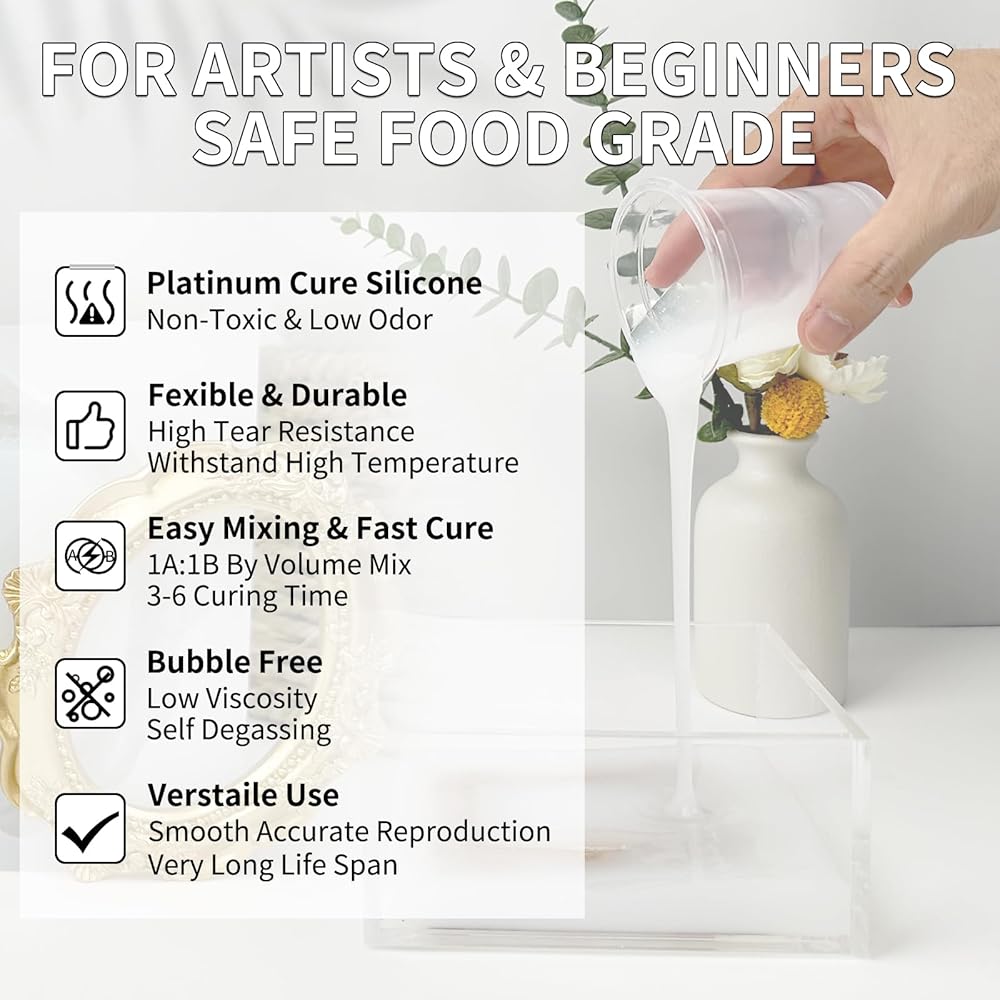 EASY MIXING & POURING: This silicone molds making kit includes part A and part B, the mix ratio is 1:1 by volume. Pour the Part A and Part B together, then stir the silicone rubber for 5 minutes, make sure to stir the liquid siicone rubber mixture thoroughly for better results. The working time is 5 minutes at room temperature.