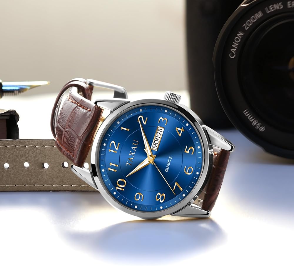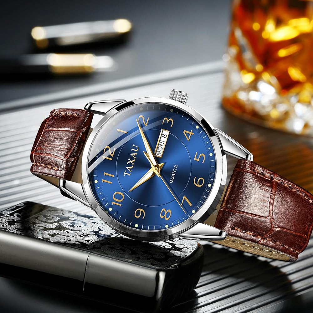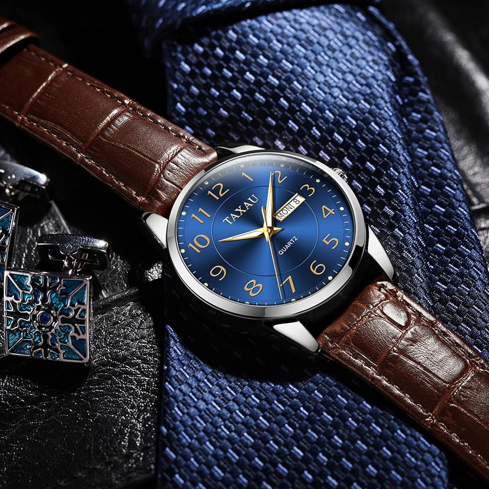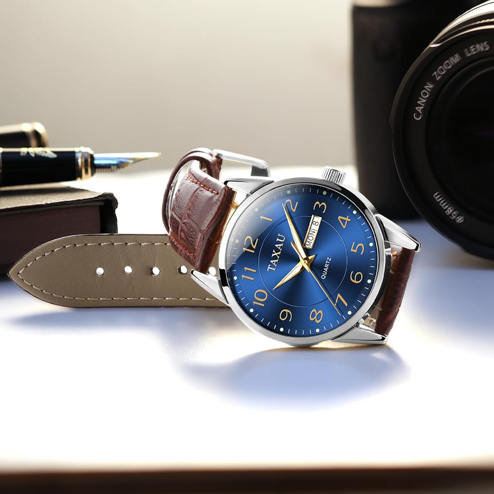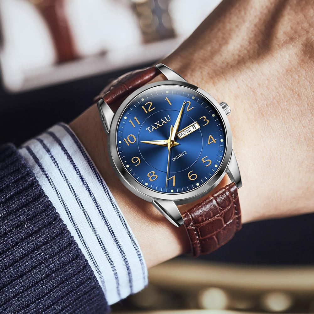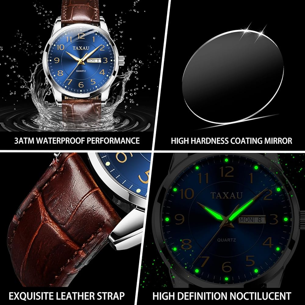 【✨Waterproof Men Watches✨】Date wrist watches for men water resistant to 100 feet (30 m),suitable for daily use.Not Suitable for deep diving,bathing,swimming,diving and other water related work.To best protect your luxury men watches,be sure to be conscious when spraying perfume,hair spray so on.Luminous watch for men is non-self-luminous,need to llluminate the watch for 30 seconds under the light to activate the ninght light function.