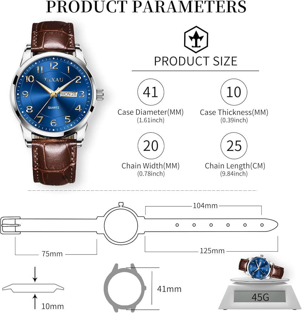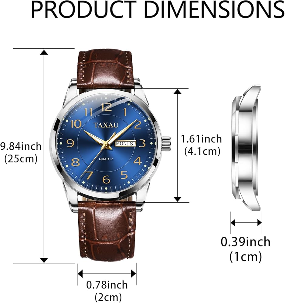 【👍🏻Product Dimensions👍🏻】This men analog watch men features a very precise quartz movement along with a date function.It will always tell you accurate time in different occasion,business,or other important places.The men classic watch of 1.6 inches (41 mm),case thickness 0.39 inches (10mm),band length 9.84inches (250mm),band width0.78inch(20mm).