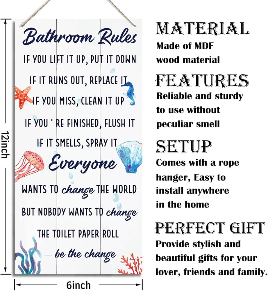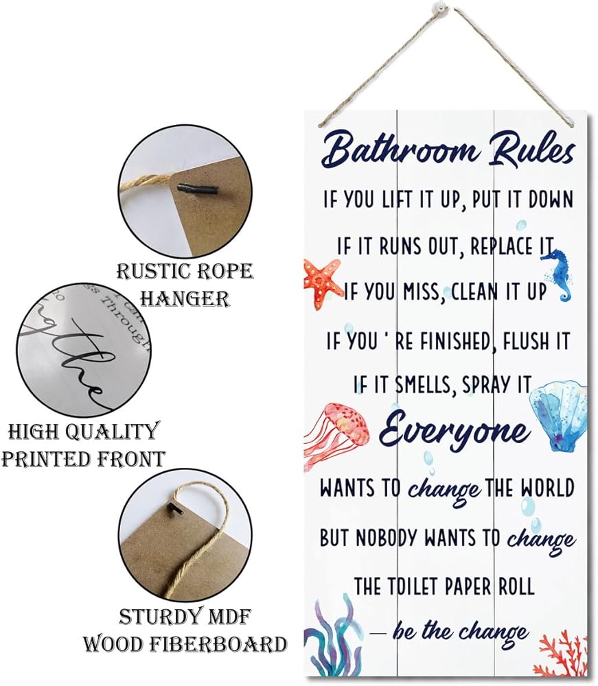 Bathroom Decor Sign, Decorative Wood Hanging Wood Plaque, Farmhouse Bathroom Decorations, Bathroom Art Wall Decor, Funny Ocean Beach Bathroom Decor, Office Home Toilet Door Hanger, Bathroom Rules Sign