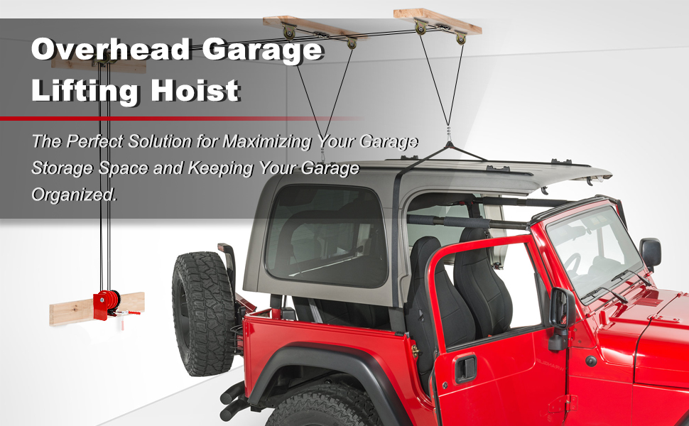 Multi-purpose Wrangler top removal lift: With a safe anti-drop system and heavy-duty construction, our garage pulley lift system can also function as a Wrangler top removal lift, safely lifting up to 300lbs with ease.