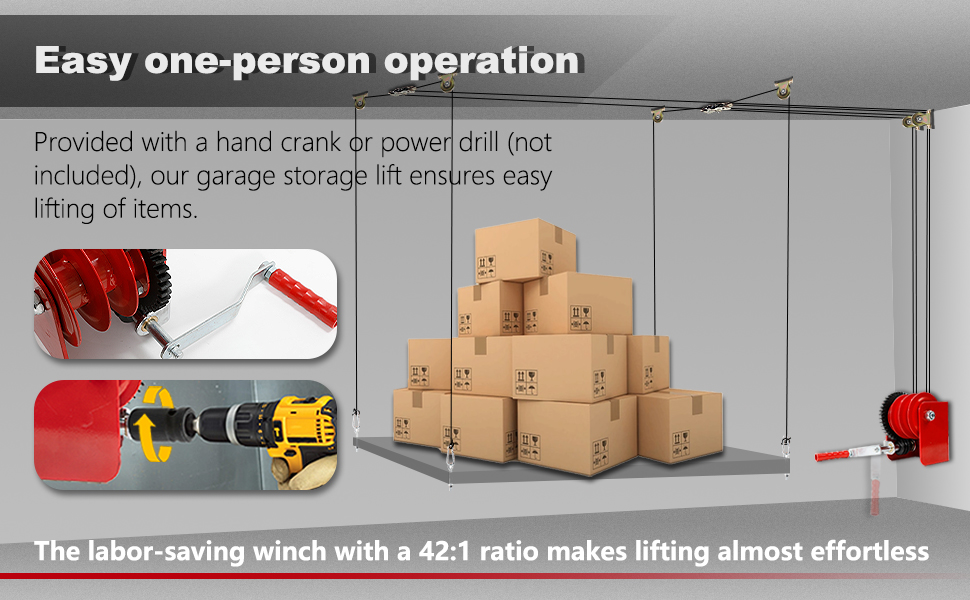 STURDY AND SAFE: Double rope design provides additional security compared to a single rope. Retractable garage storage Using a labor-saving winch, 42:1 allows you to lift items with very little force, and is equipped with a power tool docking adapter for easy use.