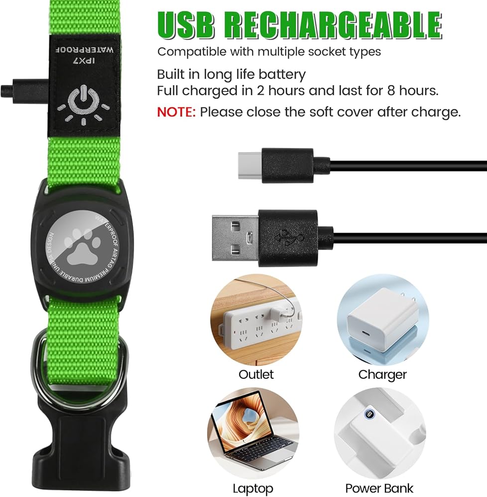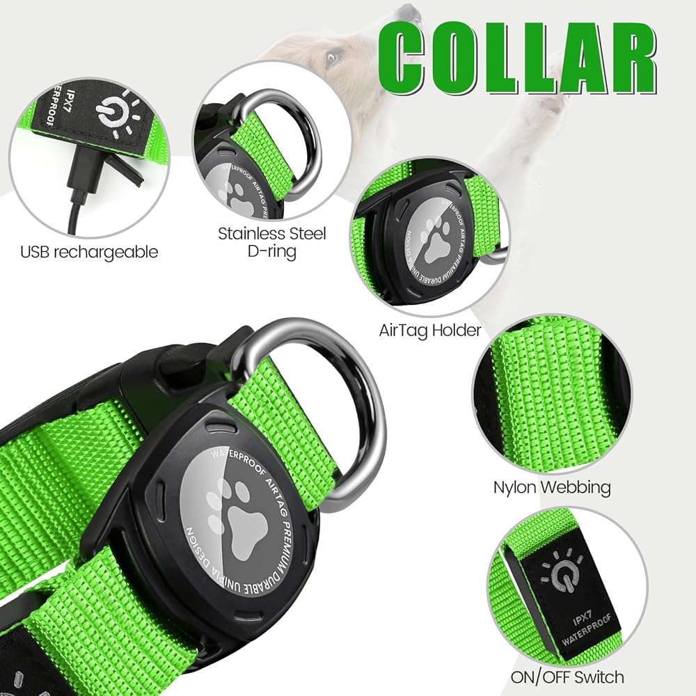 Lighted AirTag Dog Collar Rechargeable, Padded Air Tag Dog Collar, Heavy Duty Dog Collar with AirTag Holder Case, Adjustable Air Tag Accessories Pet Collar for Small Medium Large Dogs(Green,S)