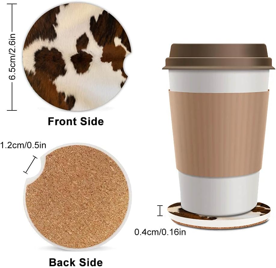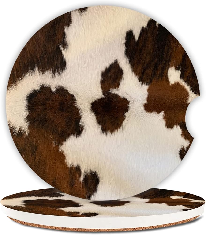 Absorbent Car Coasters 2 Pack for Women/Men,Cow Hide Car Coaster for Drinks,Ceramic Stone Car Cup Holder with A Finger Notch,Farm Animal Brown Cowhide Skin Print Cow