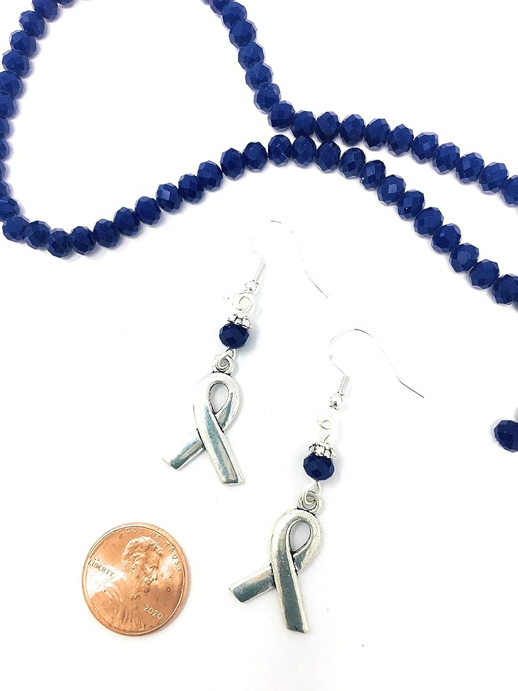 Colon Cancer Cobalt Blue Ribbon Awareness Earrings, pewter ribbon charms delicately dangle from cobalt blue crystal faceted beads, on sterling silver earwires for happy ears. Please inquire if you would like another color accent bead for support of another cancer. Handmade in the USA.