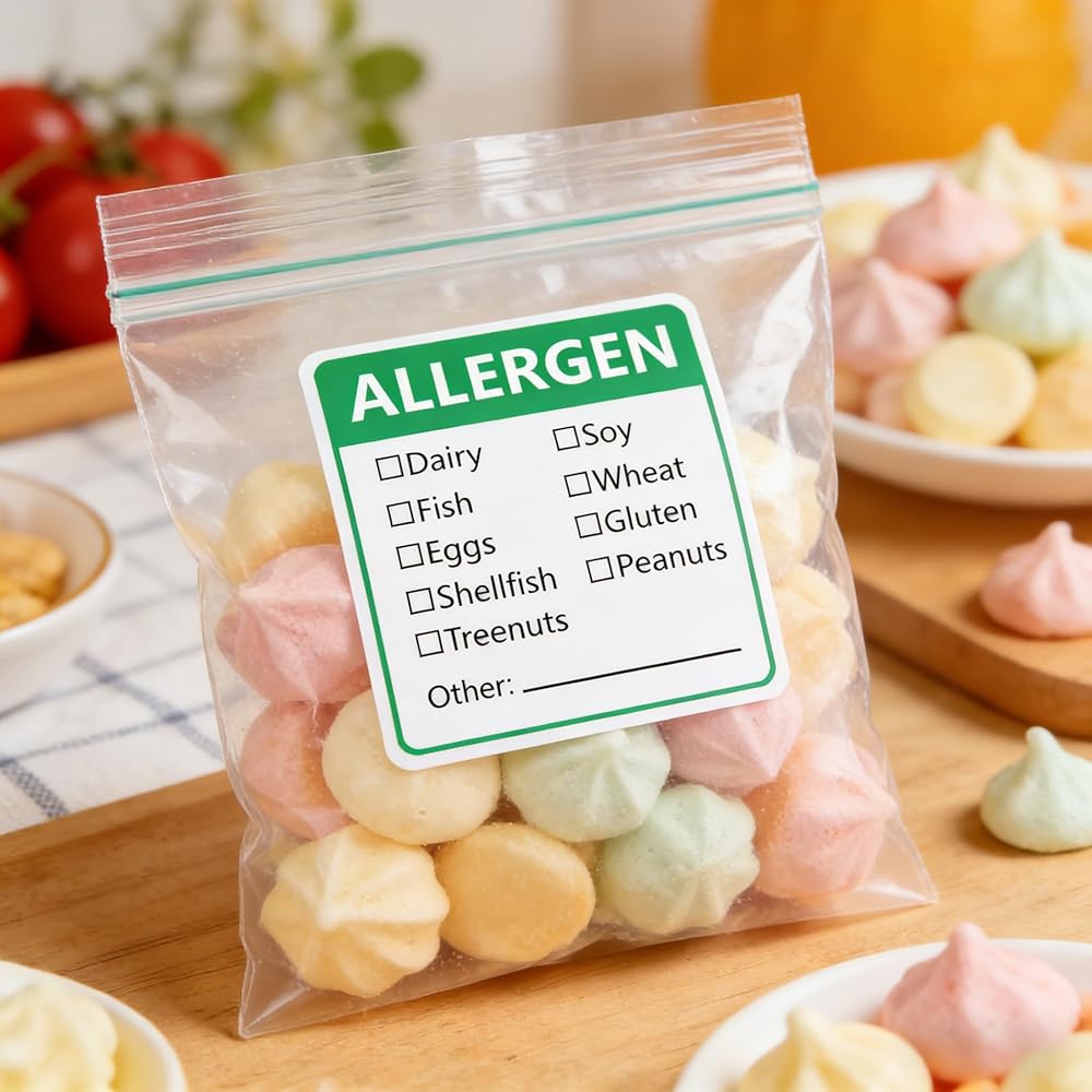 Allergen Warning Stickers size is 1.8 X 2 inch, Totally 500 adhesive food rotation labels per roll. Fluorescent Green allergen labels, eye-catching, easy to notice which food you are allergied for others. Allergen Food Warning Labels contains 9 common allergens:Dairy, Soy, Fish, Wheat, Eggs, Gluten, Shellfish, Peanuts, Treenuts and easy to write on other allergens if needed. You can use a pen, sharpie, or permanent marker to select allergens or to write the allergies on allergen stickers,perfect allergies stickers for grocery stores, restaurants, food trucks, delis, home use, kitchens, fast food, Medical, Food Service, Classroom, and Organized Summer Activity Events!