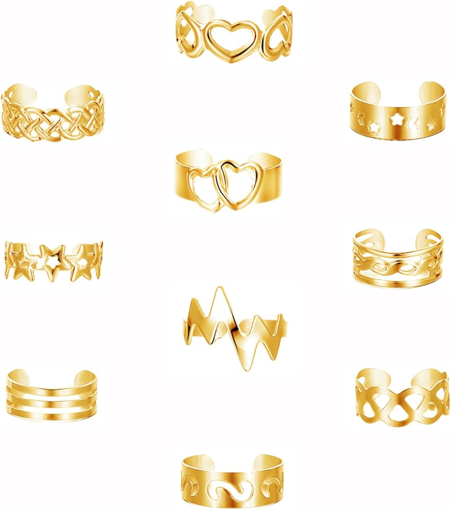 Toe Ring Set: 10 pieces toe ring set, different styles of 10 pieces toe rings, stars, moons, hearts, waves diverse elements bring chic feeling. you can easily pick some to match your daily wearing.
