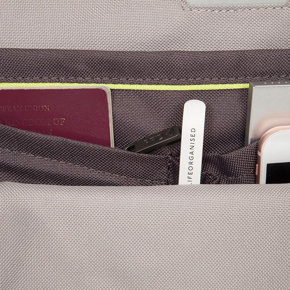 Rear exterior features detachable, adjustable shoulder straps that relieve stress of shoulders for comfort while on the move. Rear of backpack features a zipped trolley sleeve that fits luggage handles for hands-free carrying. Also features an easy to carry, top grab handle and RDIF protected pocket.