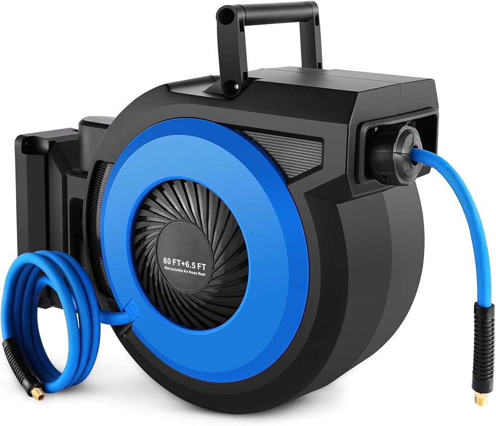 Retractable Air Hose Reel 80FT + 6.5FT, Heavy Duty 3/8" x 80FT Hybrid Air Compressor Hose Reel, Automatic Rewind, 300PSI Wall Mount Hose Reel with Brass Fittings & Bend Restrictors for Garage Workshop