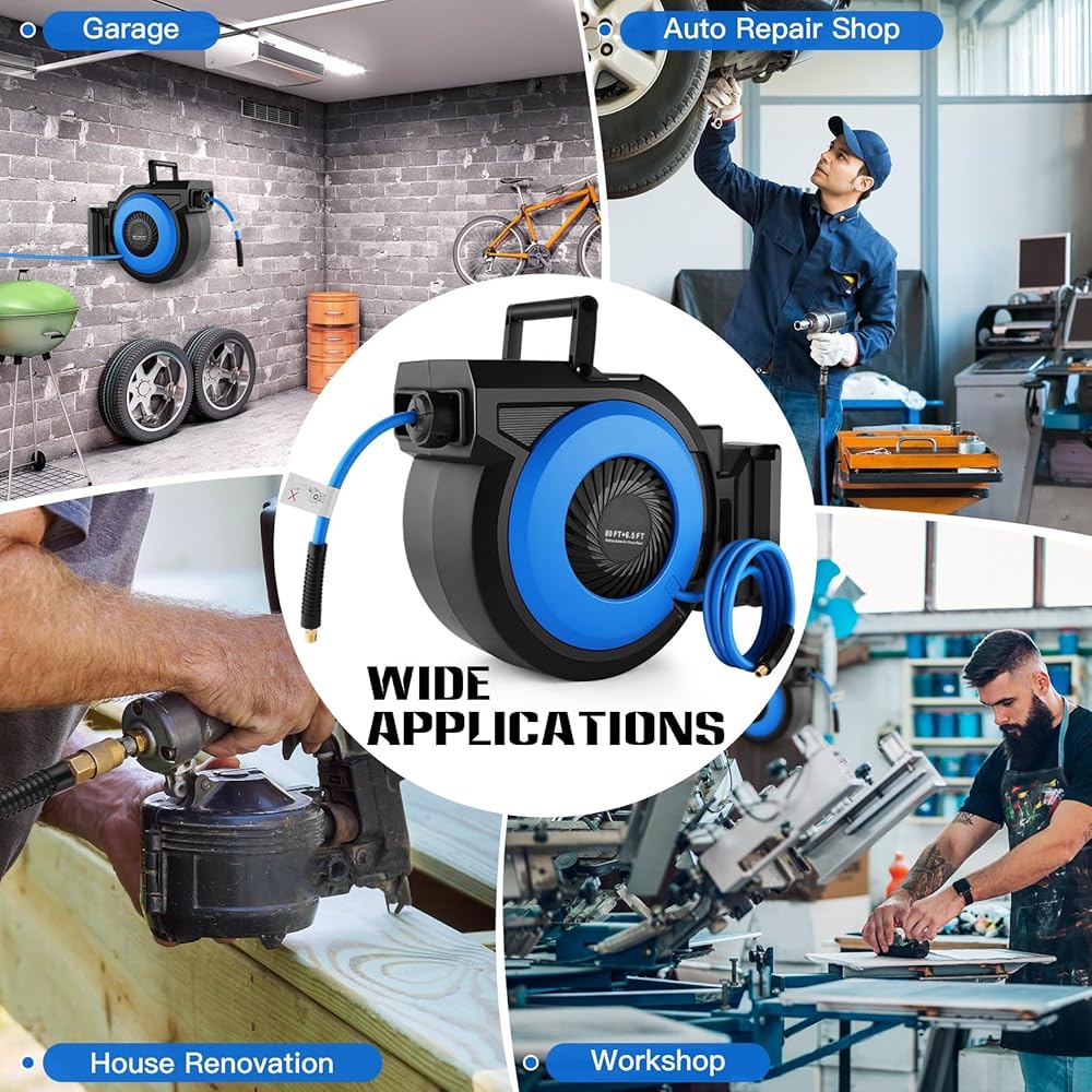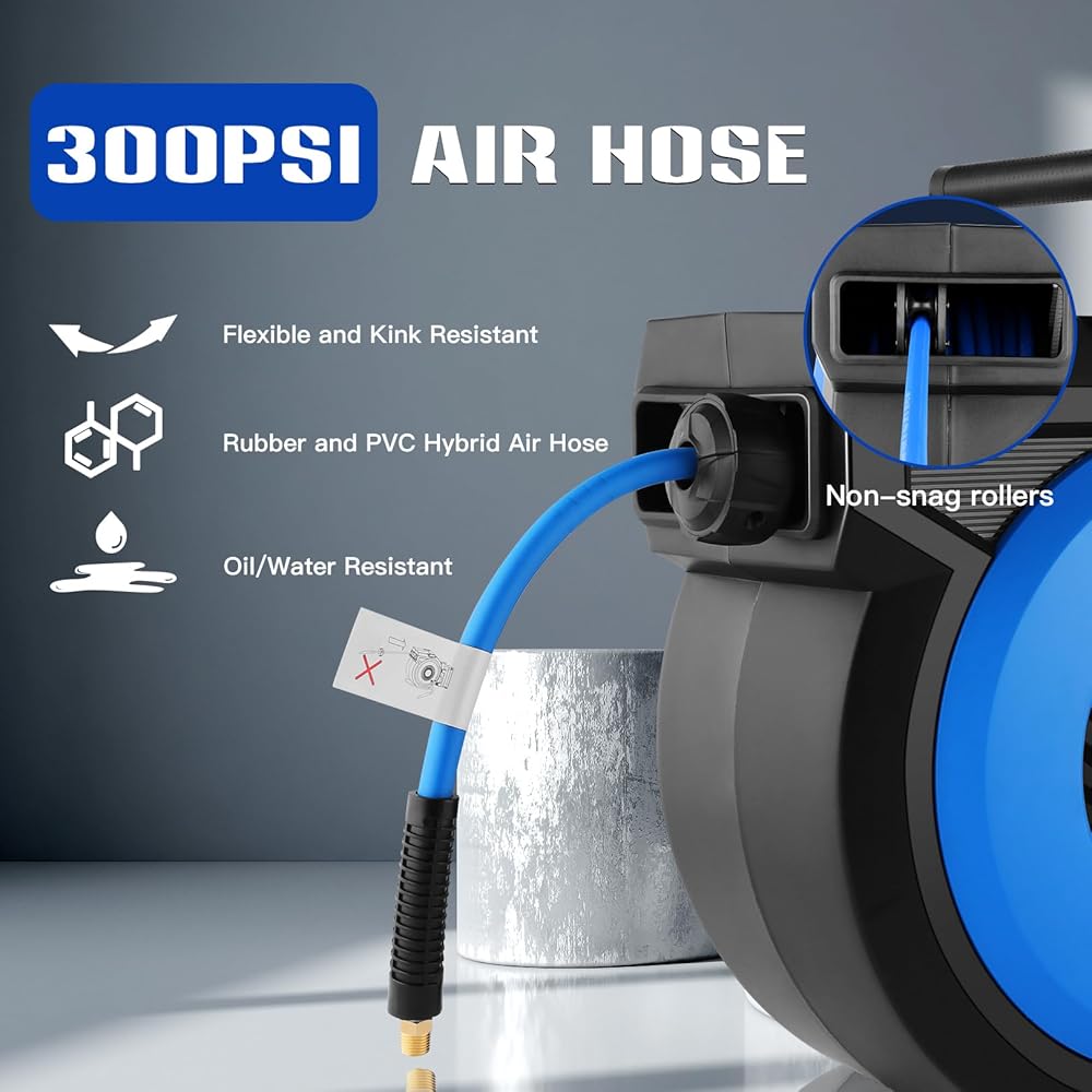 【High Quality Construction】Air hose is constructed from UV and freeze-resistant material. This all-weather flexibility Hybrid hose (-40 to 140 ℉ temperature range) is perfect for year-round use, even in the cold winter. The air compressor hose reel retractable is constructed with an impact-resistant, lightweight and durable polypropylene housing. High quality assurance ensures that it will be securely fastened to your home's ceilings or walls and is virtually indestructible.