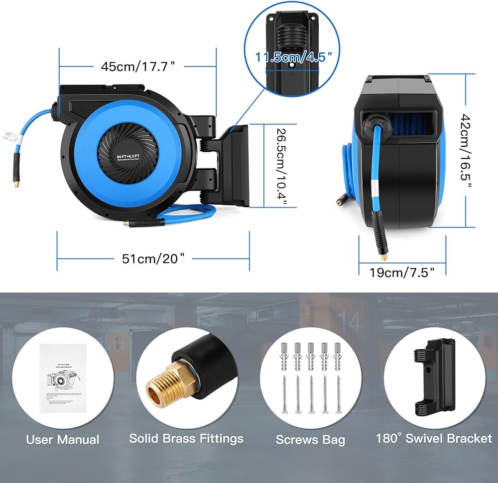【Specifics】Size: 20*7.5*16.5 inch(L * W * H). The inside diameter of the retractable air hose is a standard 3/8 in, mproves airflow by 5%. Solid brass fittings、1/4" NPT quick coupler, corrosion-resistant powder coat finish for a long service life that can last several years. Air hose max 300PSI, so it won't kink, flatten, swell, or rupture under pressure.