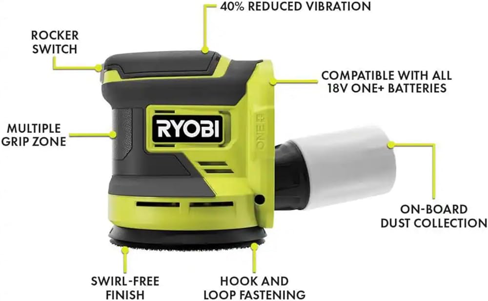 • Random Orbit Sander: On-board dust collection for easy cleanup
