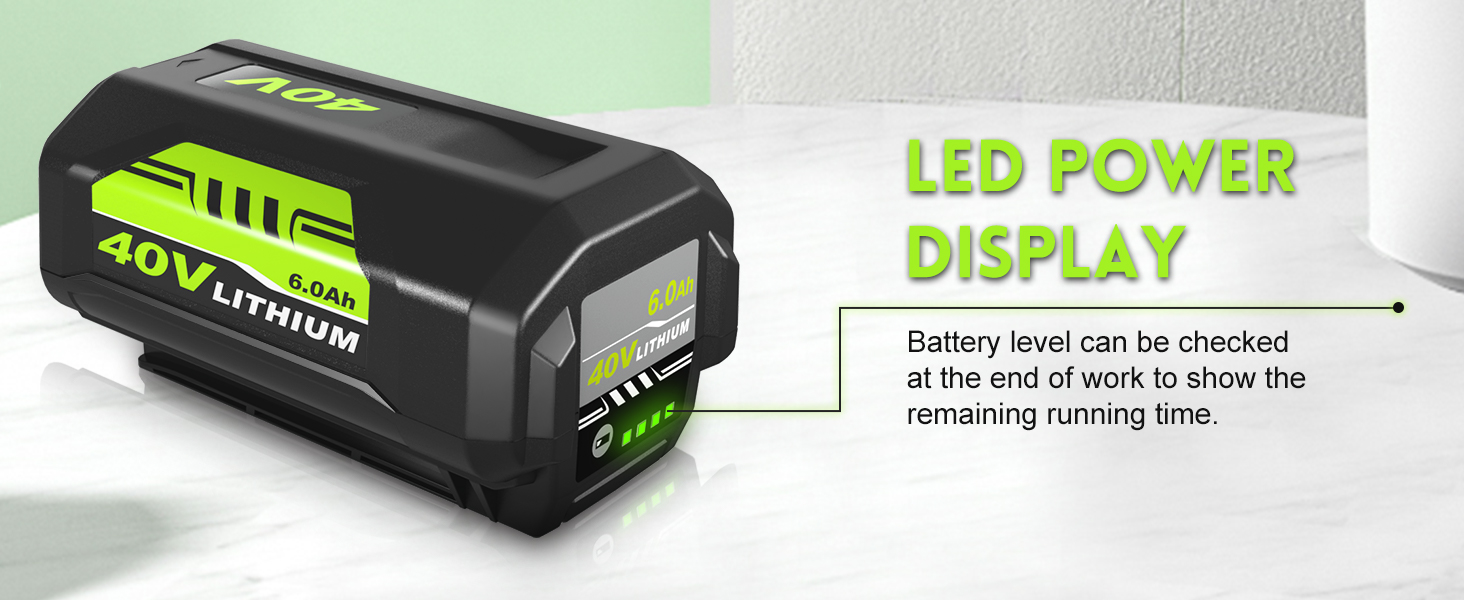 【Basic Information for Ryobi 40V Battery】- Battery Type: Lithium; Capacity: 6.0Ah; Voltage: 40V; Wattage: 240Wh; Replacement for Ryobi 40 Volt Battery . And the integrated LED indicator provides you with battery power.