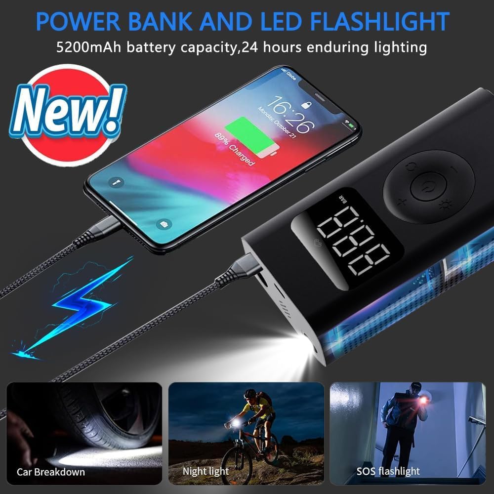 🚀【APP SMART CONTROL & FLASHLIGHT DESIGN】The air tire pump for car Available for iOS and Android.Function for real-time air pressure monitoring and adjustment by mobile phone. On the top of this air pressure pump for car tire is a LED light providing convenience for you to inflate and change tires in the dark. 2 led light modes, Short press the button to switch between long light and SOS emergency light.