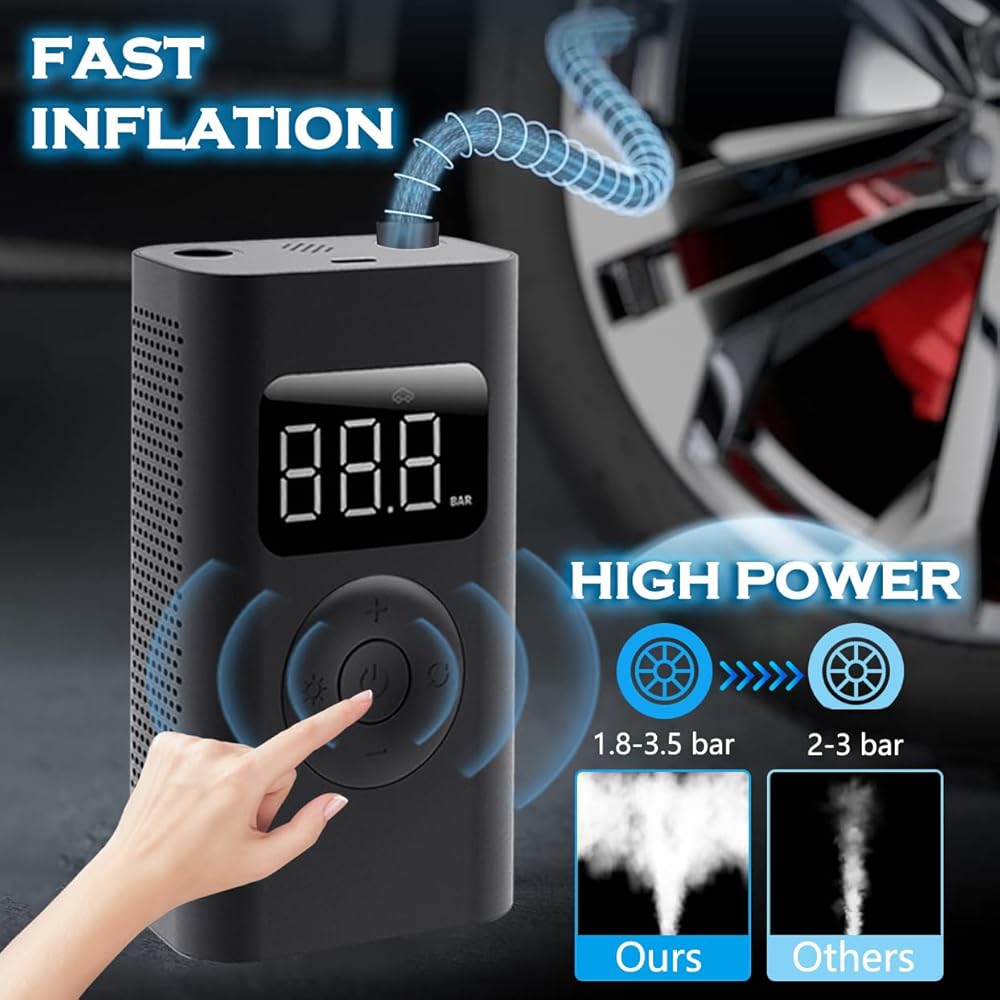 🏆【CORDLESS TIRE INFLATOR 150 PSI & EASY TO STORE】No external power supply is needed, ArTea portable air compressor for car tires with a rechargeable battery pack ,With its lightweight and compact size of 4.7 x 2.7x1.8 inches, you can simply store this battery powered air compressor in your backpack, pocket, and car center console and take it out for use anytime,anywhere.