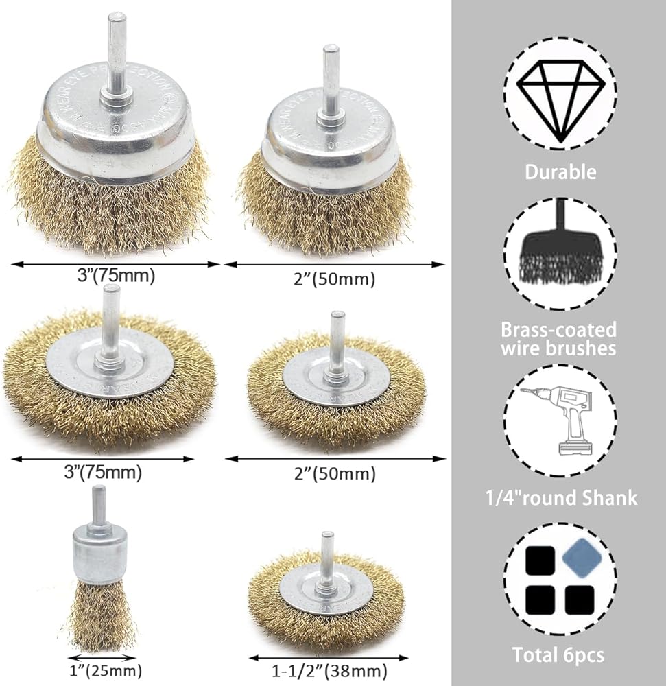 【Package Includes】: Total 6pcs. 1Pc 3" wire wheel brush;1Pc 2"wire wheel brush;1Pc 3" cup brush;1Pcx 2"cup brush;1Pc 1-1/2" wire wheel brush;1Pc 1"end Brush with 1/4 inch shank. The wire wheel for drill kit is much cost-efficient than buying from a local tool store