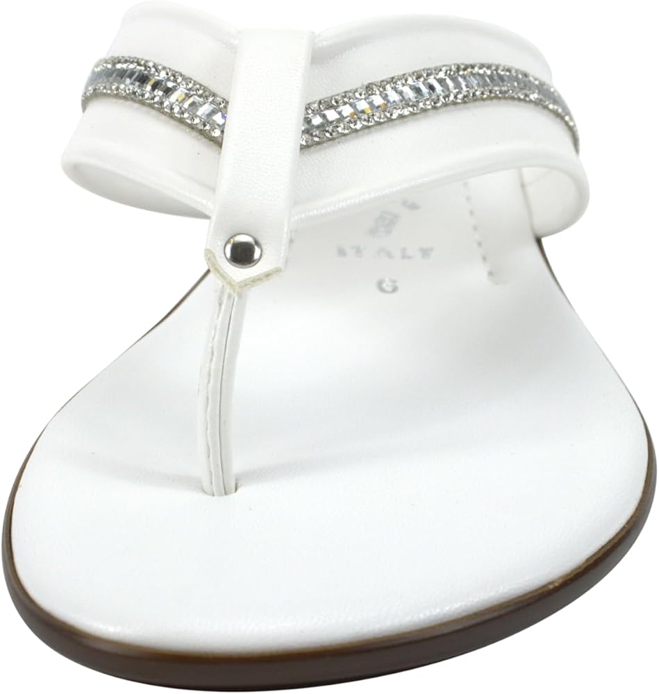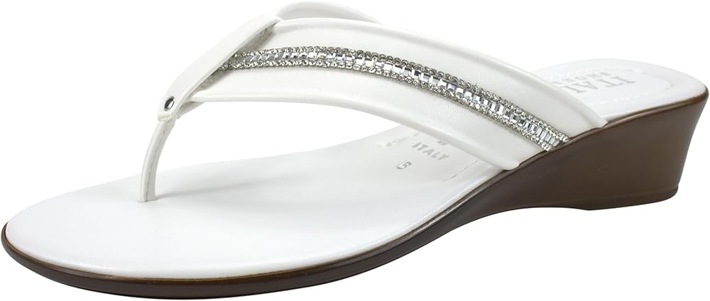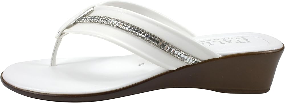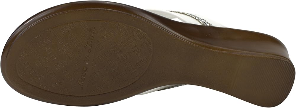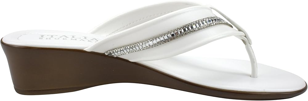 Elevate your summer style with the Italian Shoemakers Women's Sunsyn wedge thong sandal. Crafted with a stitched padded footbed, these sandals offer superior comfort for all-day wear. The sleek profile and rhinestone embellishments on the thong strap add a touch of glamour to your look. Whether you're hitting the beach or strolling through the city, the Sunsyn sandal will keep you looking chic and feeling comfortable. Available in popular colors like Navy, Luggage, Black, and White, these versatile sandals can easily complement any outfit. With a comfortable toe post and a wedge sole (approximately 1 5/8 inch), these sandals provide both style and support. Upgrade your warm-weather wardrobe with the Italian Shoemakers Women's Sunsyn platform thong sandal.