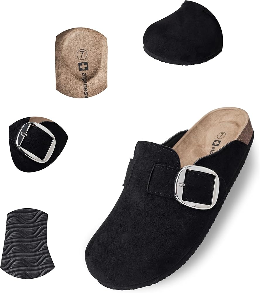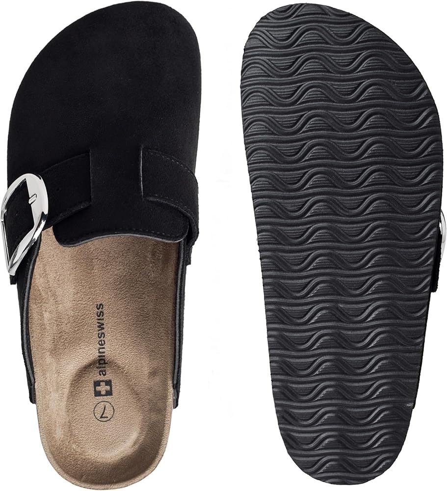 Edith Clog Slippers By Alpine Swiss Product Features: Microsuede Upper, EVA Outsole STYLISH – The Alpine Swiss Edith Clog slippers will be your new favorite go-to shoes. These easy slide on mules are stylish and versatile! Wear them lounging at home or out running errands. CLASSIC – The classic boston clog design with an accent buckle is simple and trendy. The round toe design creates a spacious toe box. COMFORTABLE – The ergonomic footbed is lined with super soft microsuede and the EVA insoles will mold to the shape of your foot over time for the most comfortable fit. QUALITY – Crafted with durable EVA outsoles that are lightweight and flexible. The microsuede upper is super soft and stylish. FIT – Ideal for medium width feet. Full sizes available only, we recommend half sizes round up. MSRP $55.00