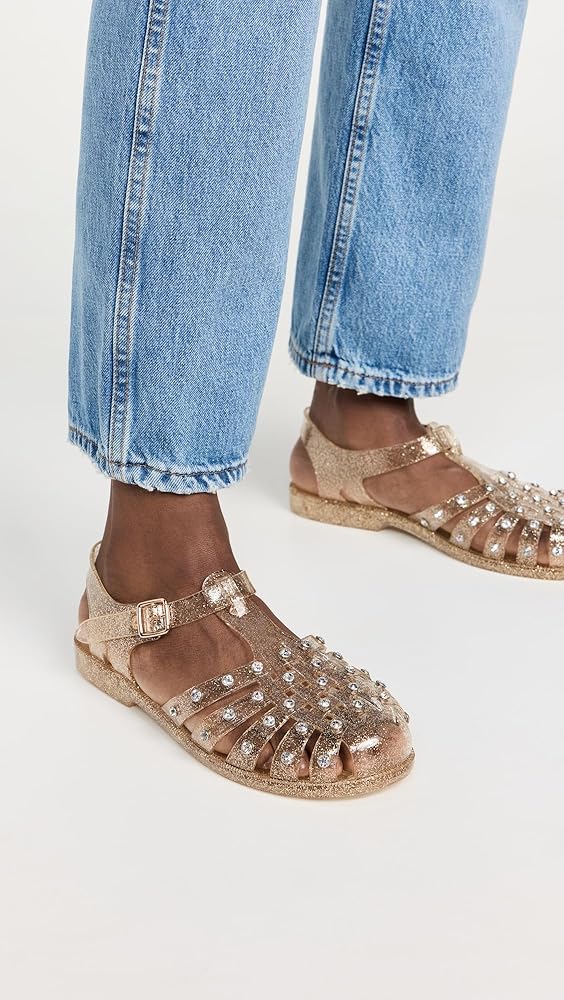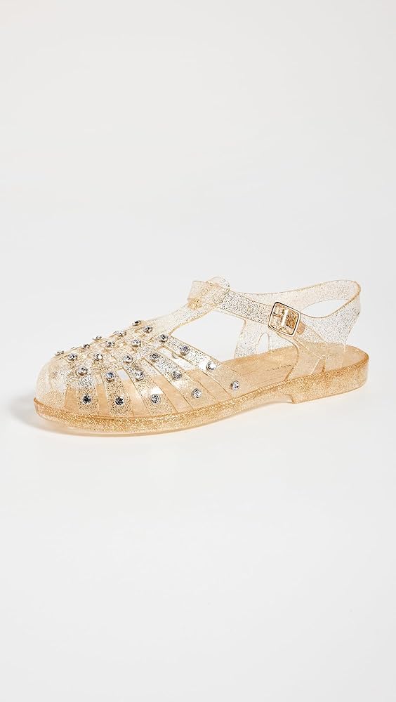 Flat fisherman sandal in champagne glitter jelly material with crystal stud embellishments. Features a buckle closure.