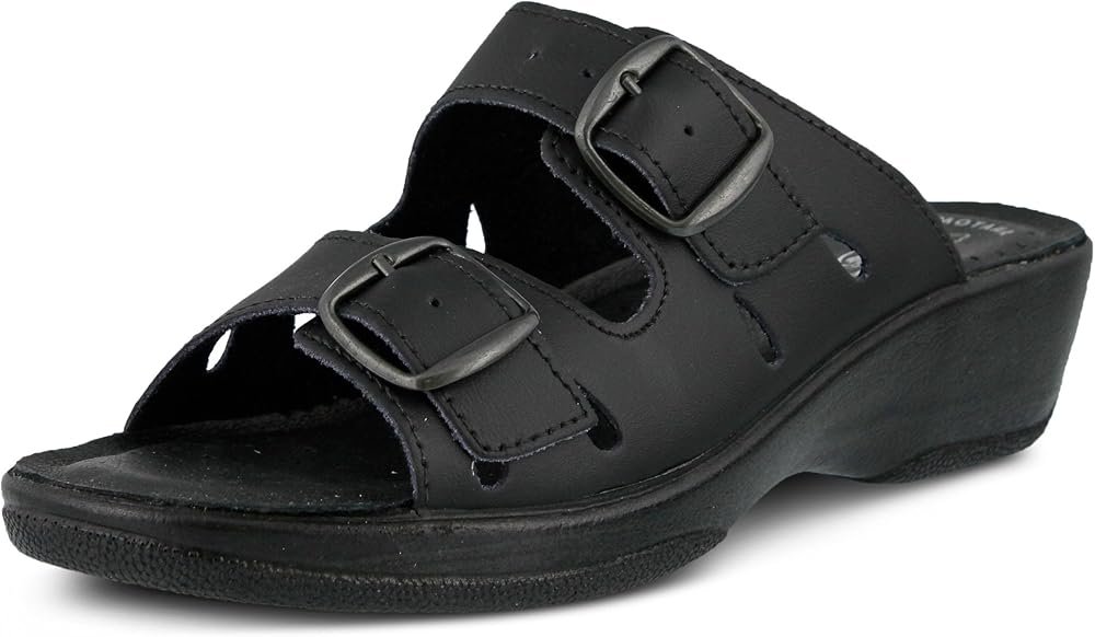 - Flexus Style: Decca Italian made, slide leather sandal fashioned with metal buckles.
