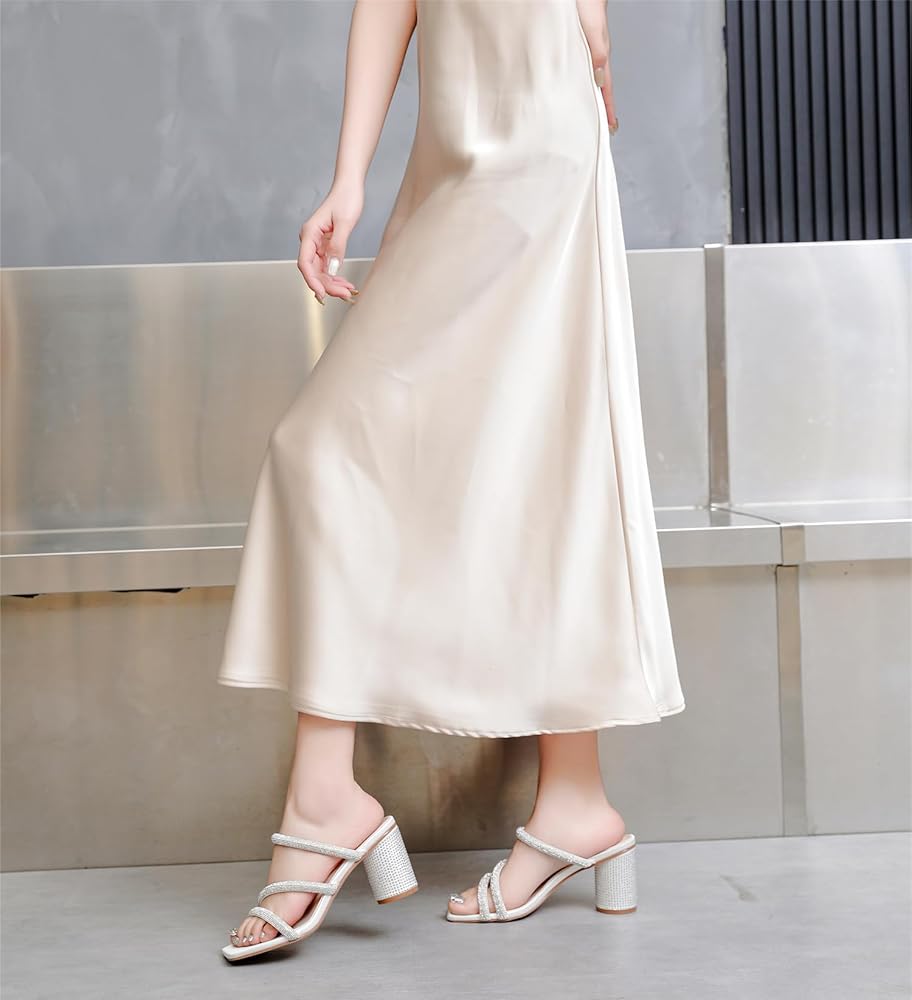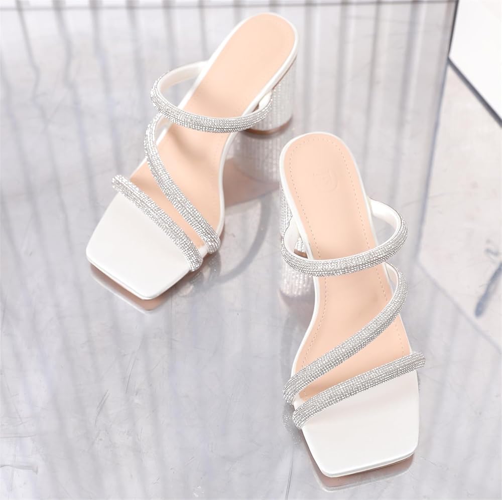 【Chunky Heel Summer Sandals Women】Open toe heeled slides high light your personality,the thin straps embellished with sparkling rhinestones is more delicate,avant-garde and unique, you can easily become a fashionista!