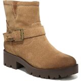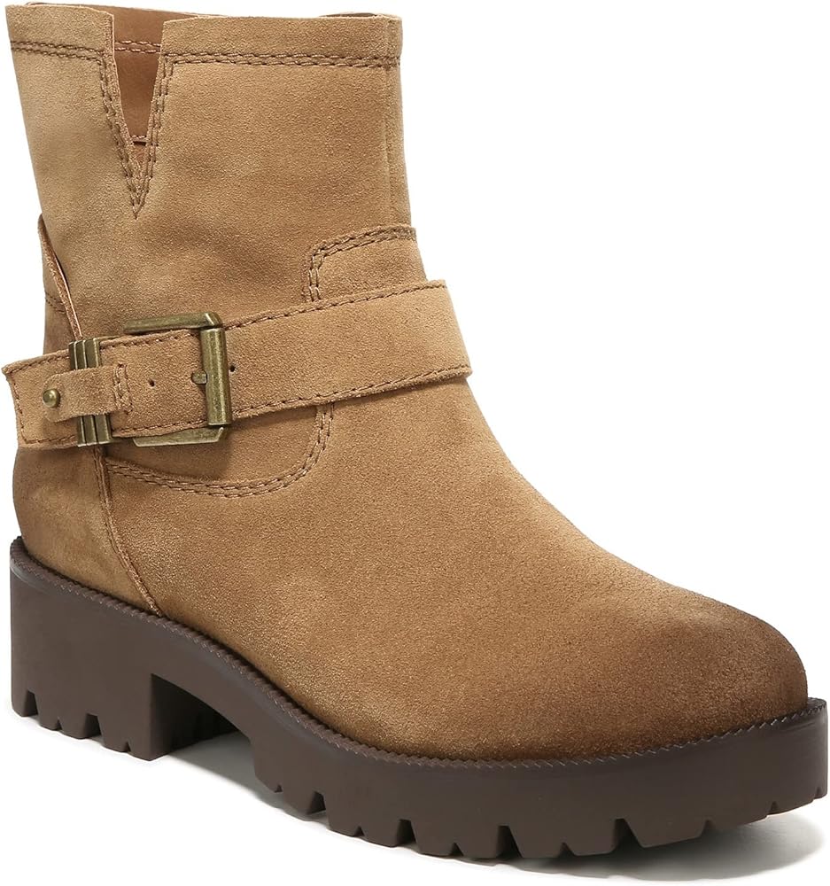 Go moto. This motorcycle boot's unique details and utilitarian design offer all day edge. Leather or suede upper. Strap detailing. Side zip closure. Round toe. Extra arch and heel cushioning for comfort with every step. 1 1/2 inch heel. Lug outsole.