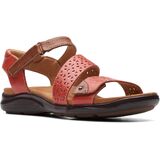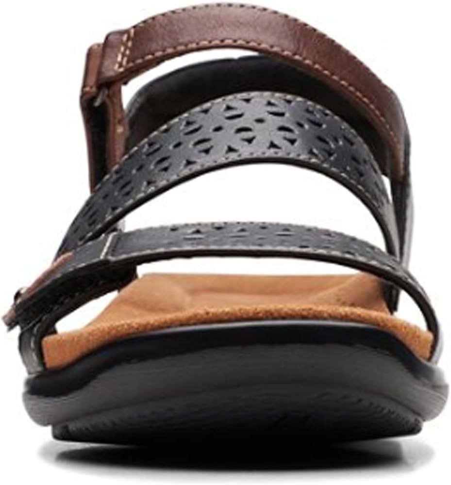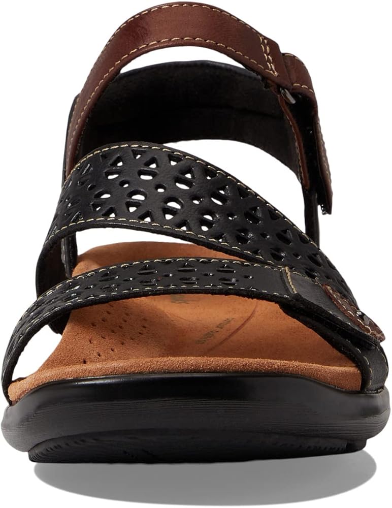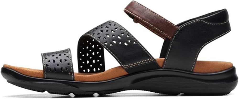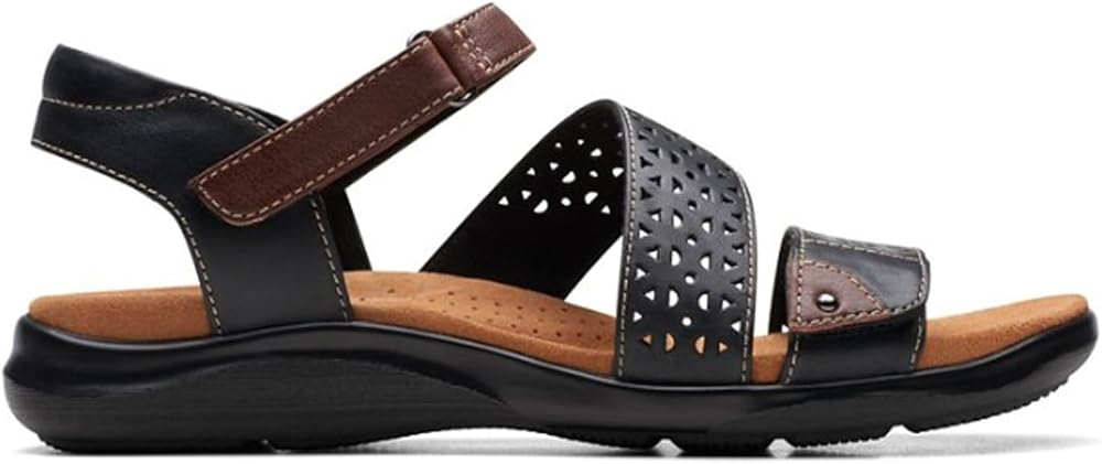 Walk around in comfort wearing the Clarks Kitly Way Sandals. Leather and textile lining. Leather and textile insole with Cushion Plus shock-absorption technology. Raised open-toe. Hook-and-loop ankle closure. Cut-work design on straps. Synthetic outsole. Weight of footwear is based on a single item, not a pair.