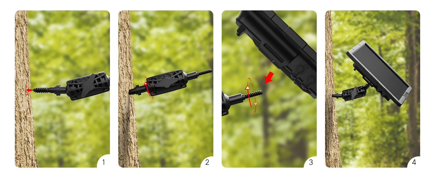 Adjustable Camera Arm Tree Mount: Place the expansion screws into the pre-drilled holes in the surface of the fence or tree before screwing in the tracking camera bracket and loosening the individual adjustment knobs to rotate the ball joints to adjust the orientation of the unit;