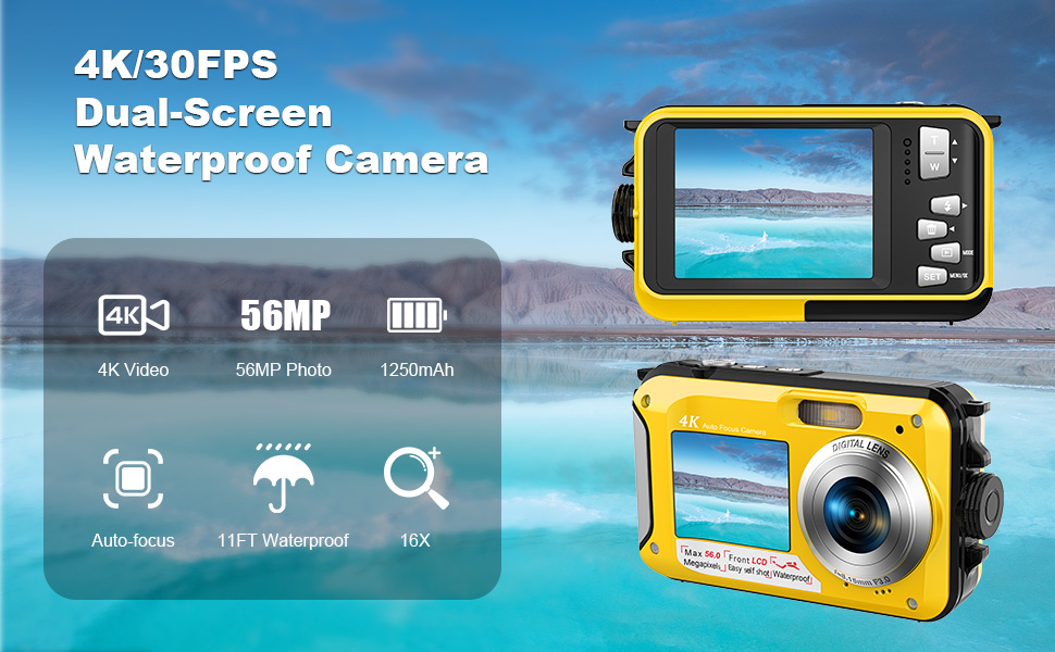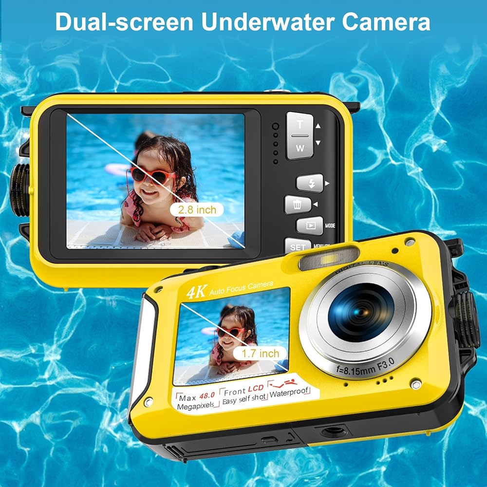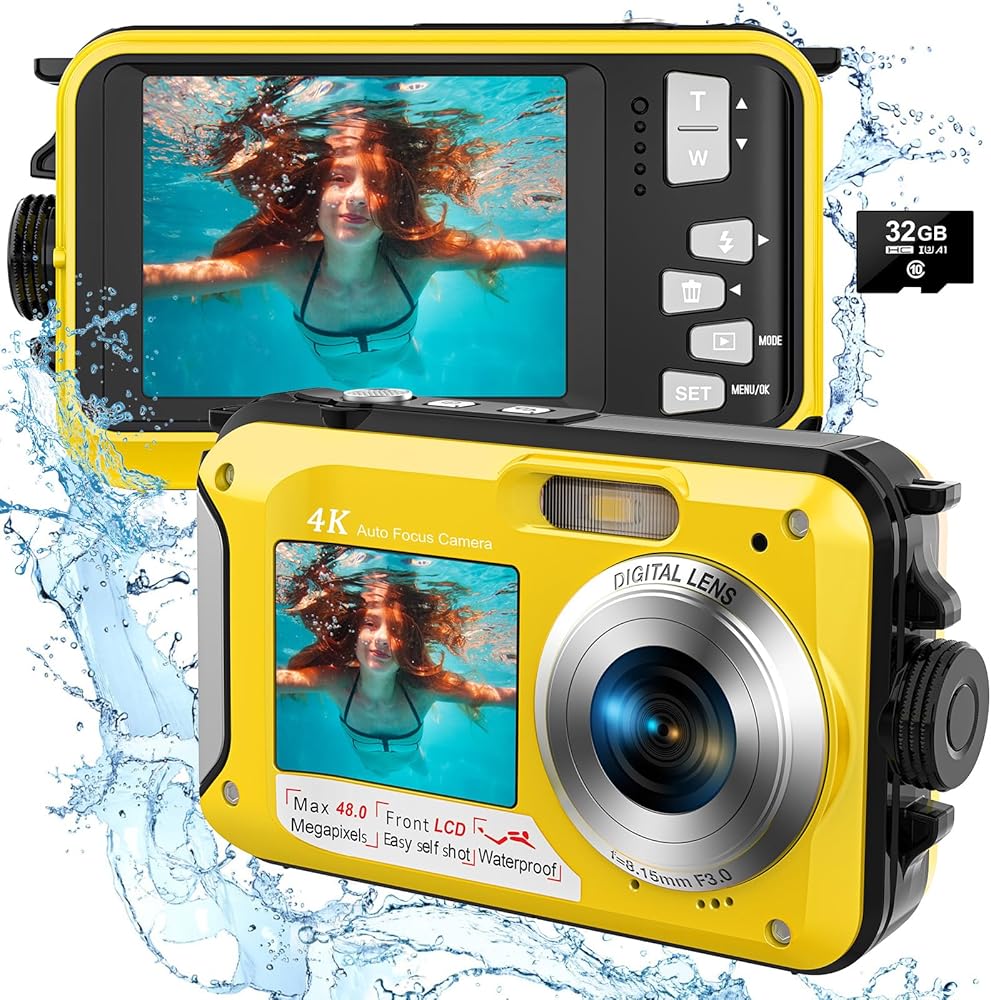 Waterproof Camera 4K 48MP 11FT Underwater Camera Autofocus Waterproof Digital Camera 16X Digital Zoom Selfie Dual Screens Kids Underwater Camera for Snorkeling with 32GB Card