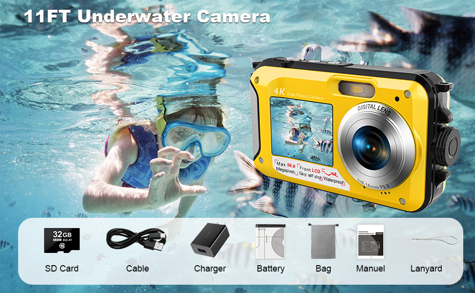 【11FT Underwater Camera】 This camera can be submerged 11 feet underwater without a waterproof case. Before staying underwater, please be careful to ensure that the battery door is locked to waterproof into the camera, you can take it to diving, swimming, snorkeling and other activities. To take it and you will not miss any scenery you want to record.