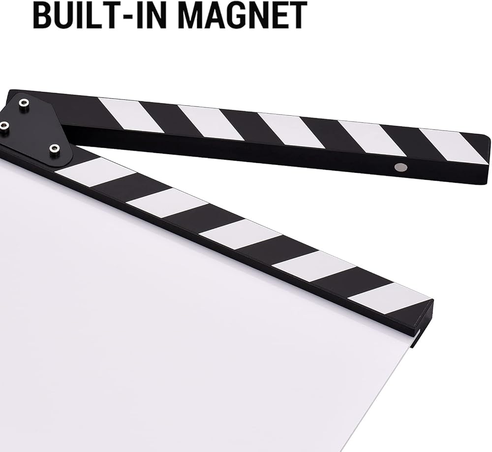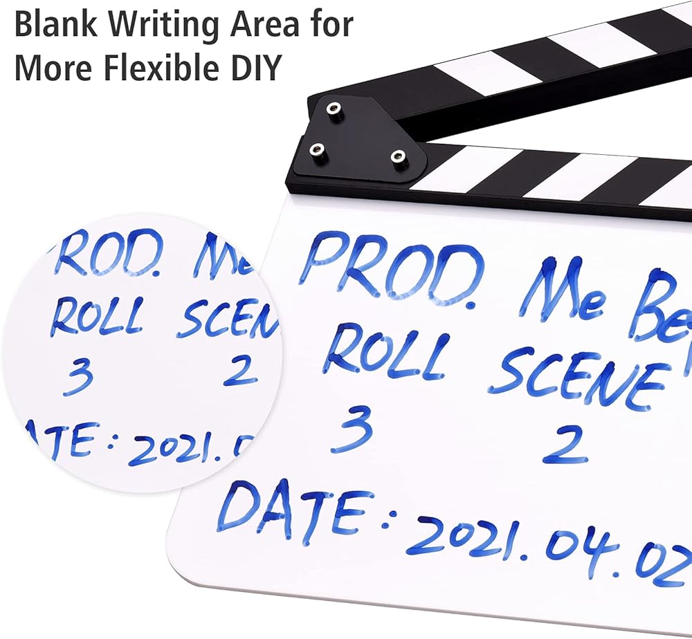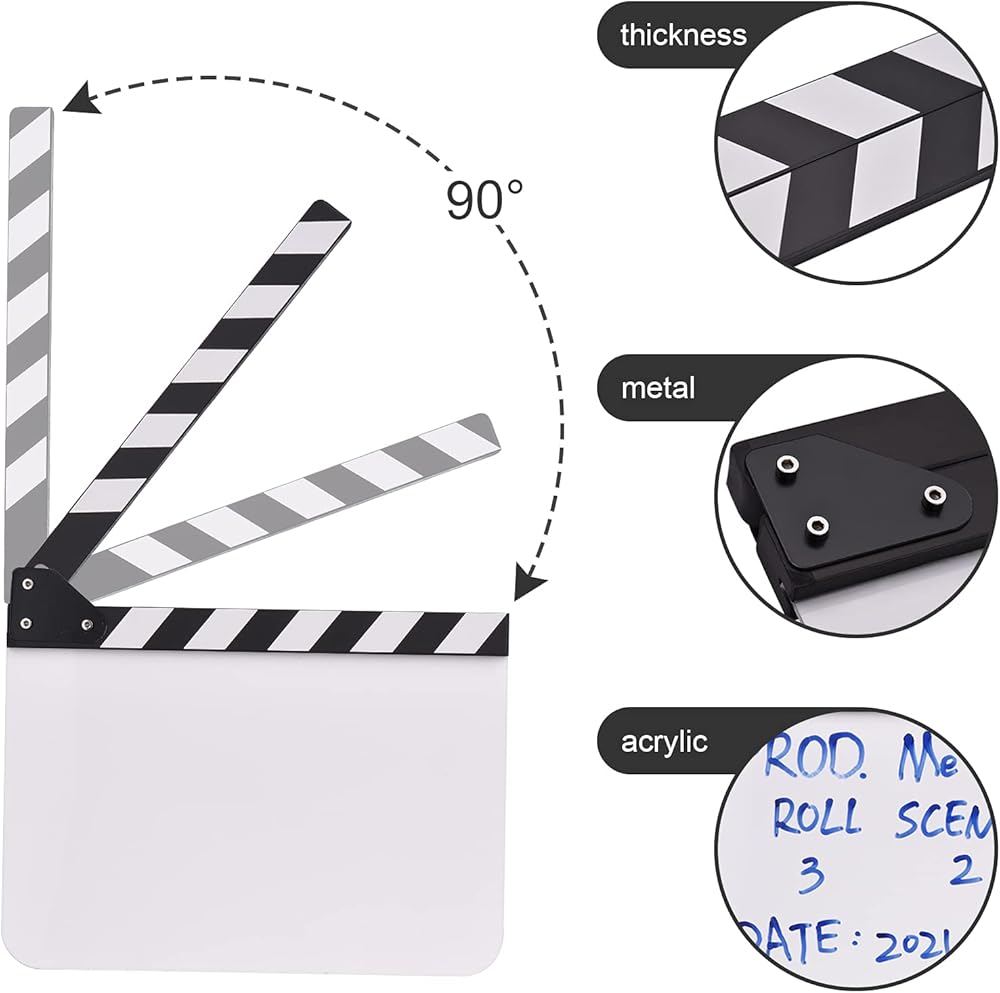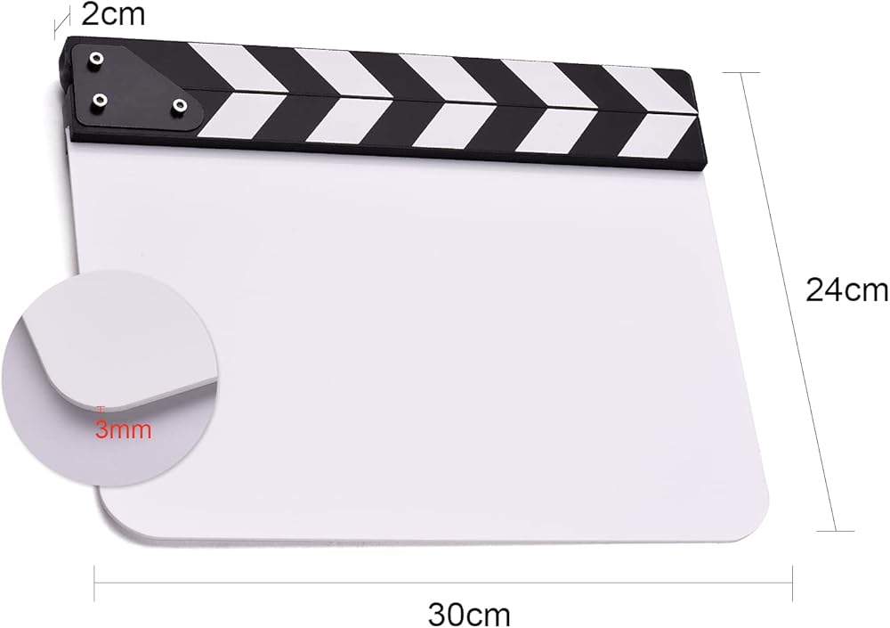 Features: The clapboard is designed for film, TV series, studio live, advertising, video recording, etc. Dimension: 30 * 24cm/ 12 * 9in, the size of writing area: 30 * 19cm/ 12 * 7.5in. The writing area is blank, has no any printing letters, which allow DIY freely. High-quality acrylic material, easy to write and clean, durable to use. Wooden clapper sticks have built-in magnet for stable and audible closure. Specifications: Color: Black & White sticks/ Multicolored sticks(optional) Material: Acrylic + Wood Writing Area Size: 30 * 19cm/ 12 * 7.5in Item Size: 30 * 24 * 2cm/ 12 * 9 * 0.8in Item Weight: 415g/ 14.6oz Package Size: 32 * 25.5 * 3.5cm / 12.6 * 10 * 1.4in Package Weight: 520g/ 18.3oz Package List: 1 * Clapboard