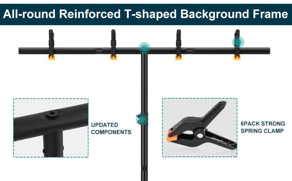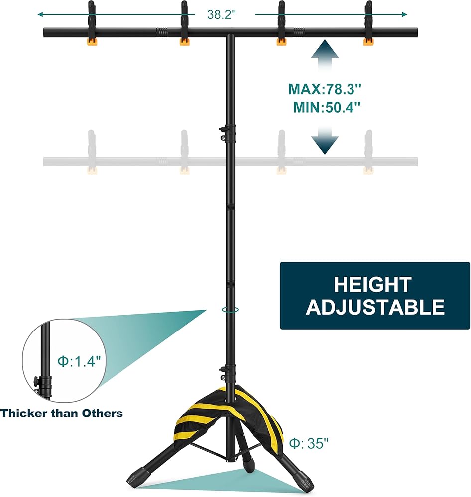 【Upgraded Connection for More Stability】:T-shape backdrop stand will not bend or leave gaps for long-term use. We added elastic ropes to both the horizontal and vertical poles to make it easier to form a complete whole. 1.5-inch thickened diameter fully ensures stability.