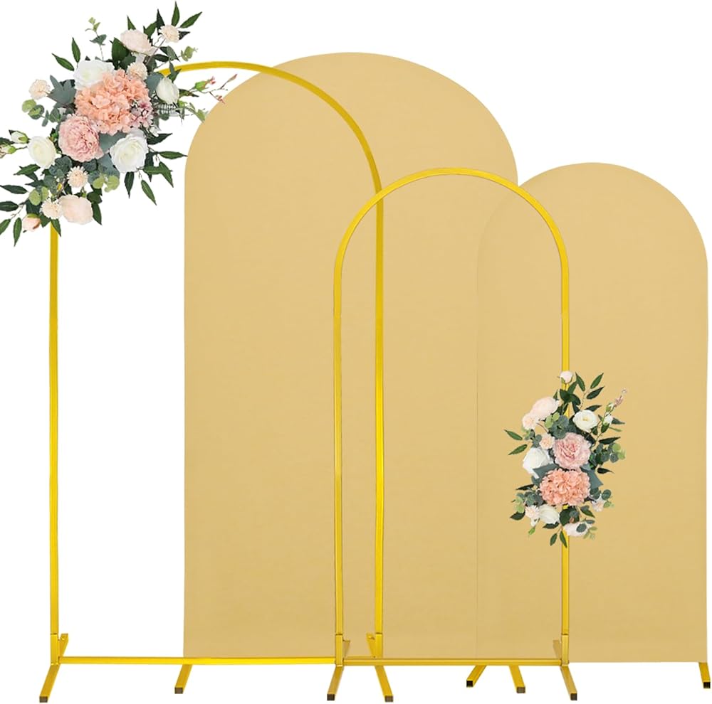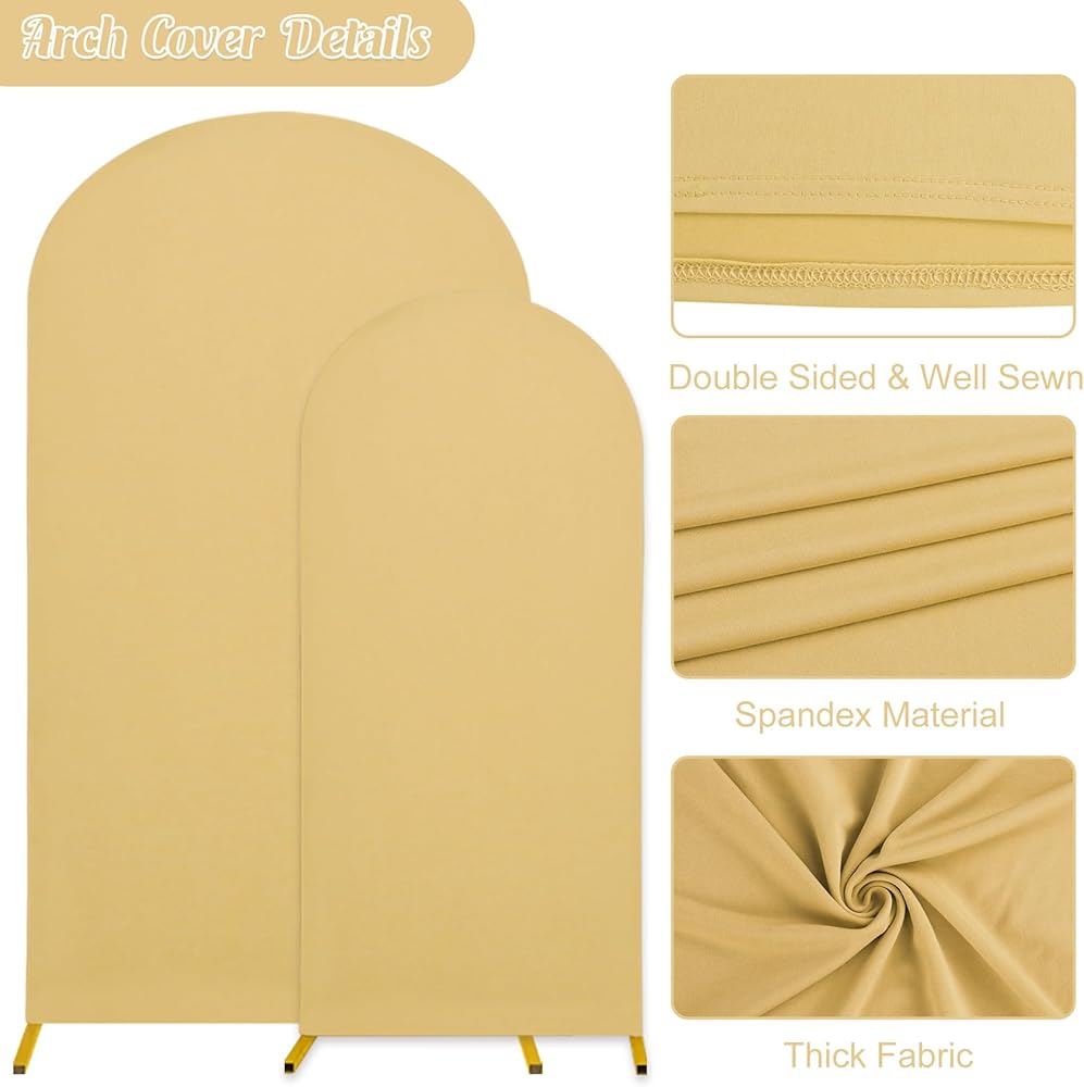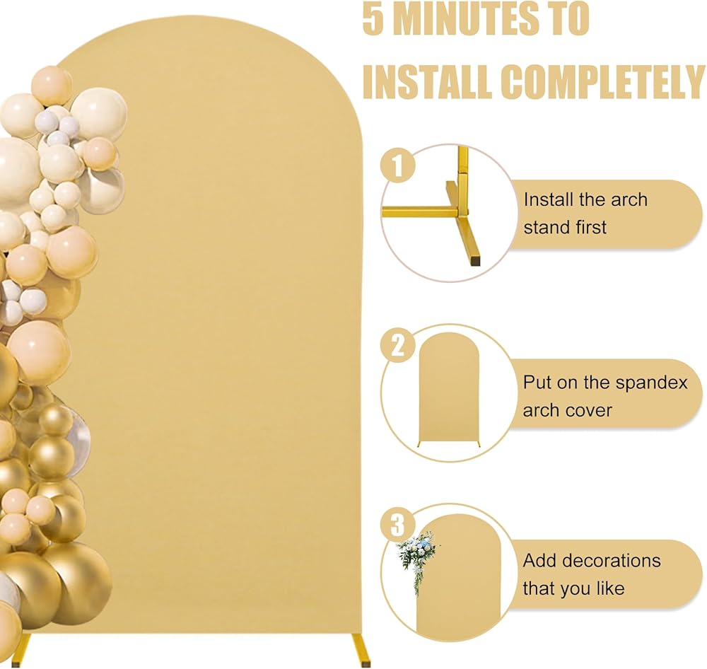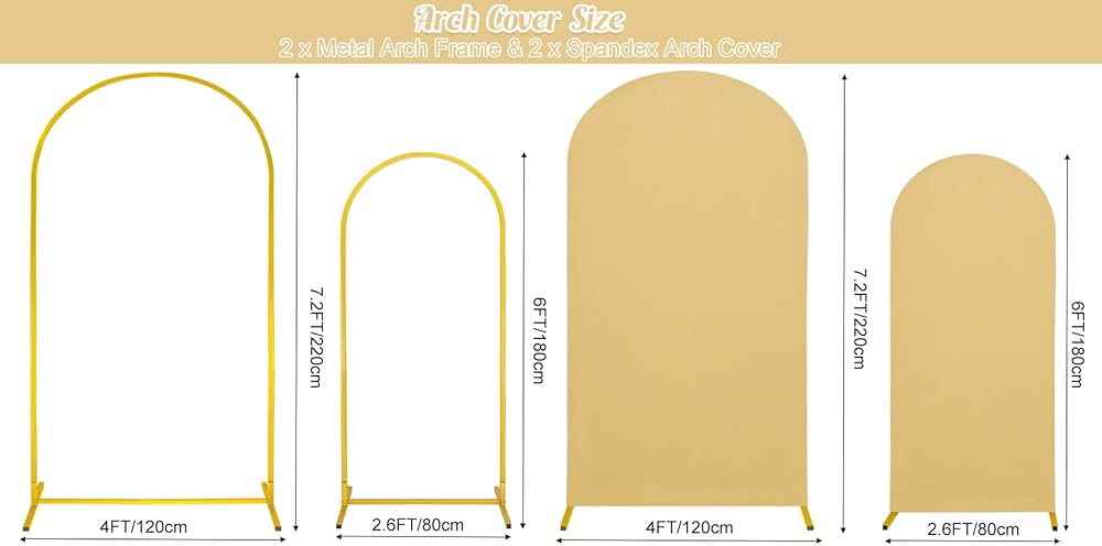 【Set of 2 Wedding Arch Stand and Spandex Cover】 You will receive 2 pieces different size of wedding arch frame and matching arch backdrop stand cover. Instructions are also included. Size: 7.2FT(H)x4FT(W), 6FT(H)x2.6FT(W). The two metal arch stands are made of high quality metal, and chiara round top backdrop cover are made of premium polyester and spandex. The arch stand can be used separately or together. This set will provide you with an elegant and look for your events.